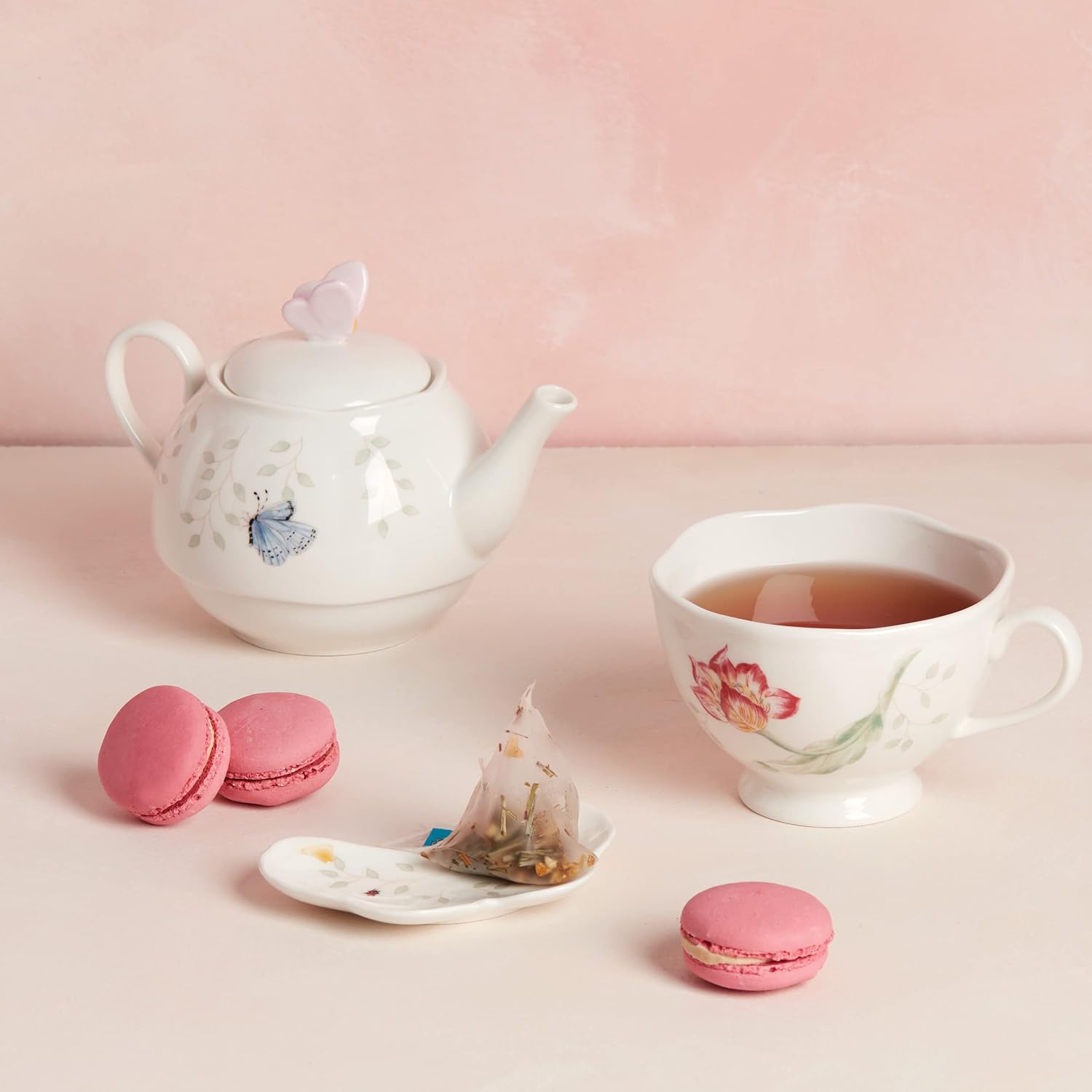 - Teapot features a light pink butterfly as its top handle to tie the look together; Hand wash for care