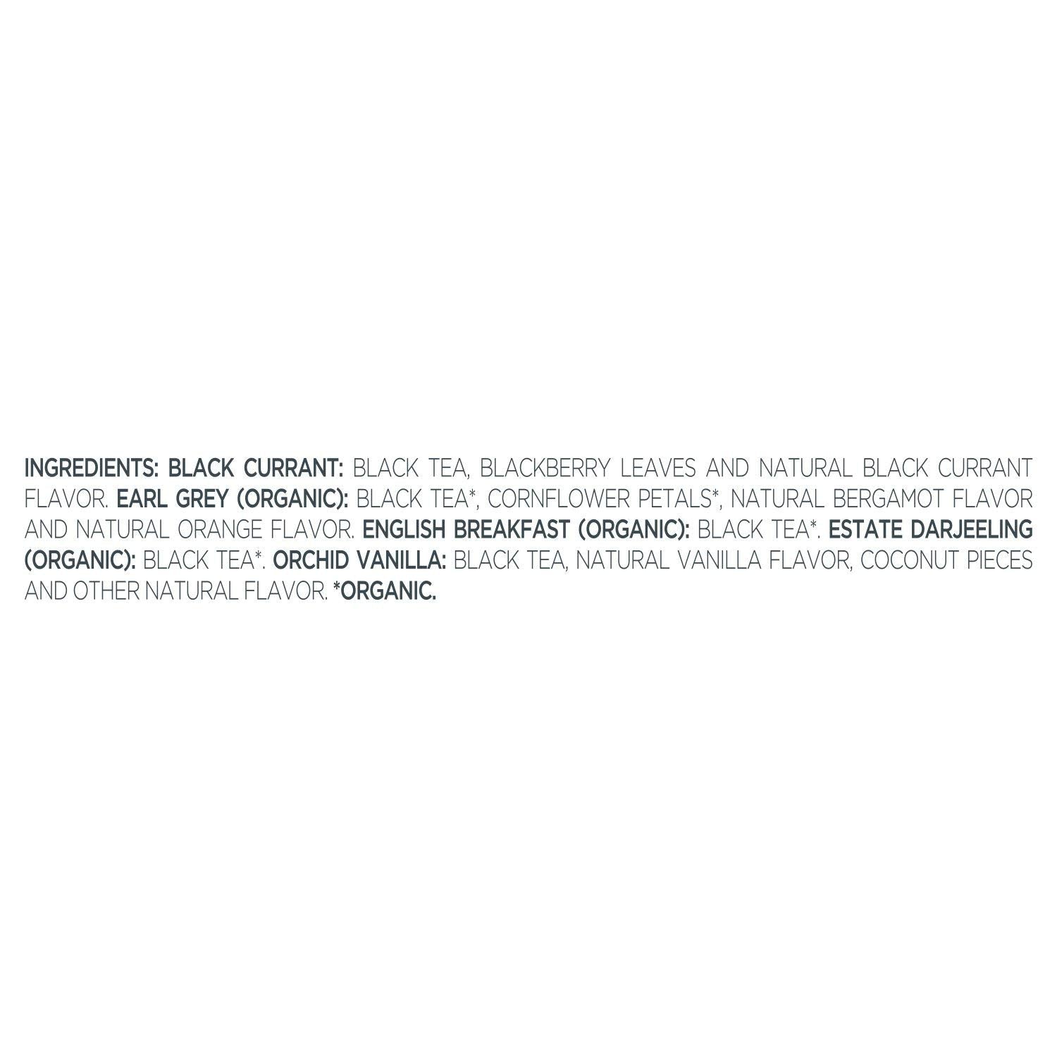 - BLACK TEA ASSORTMENT with five varieties of our most popular black tea blends - Earl Grey, English Breakfast, Estate Darjeeling, Black Currant, Orchid Vanilla.