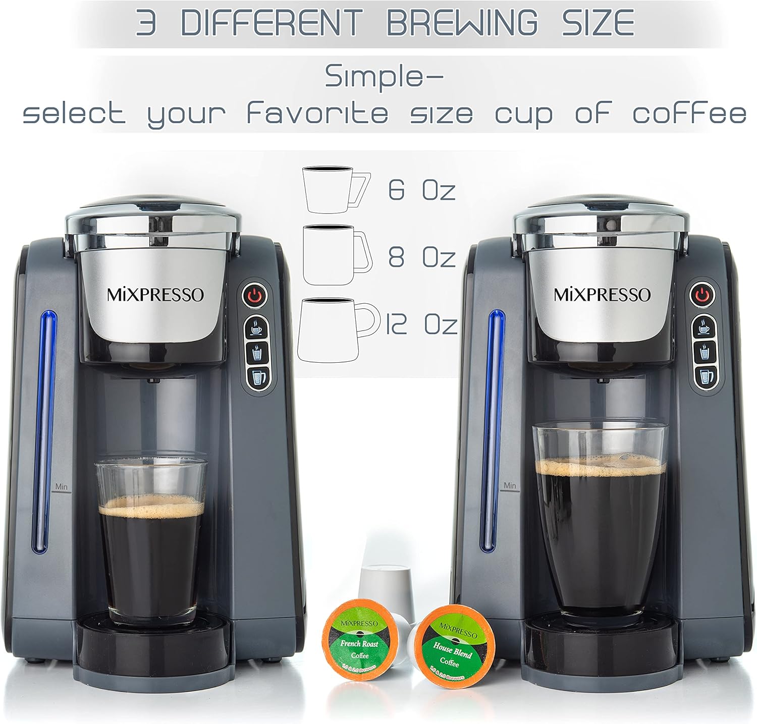 Mixpresso Single Serve K-Cup Coffee Maker With 4 Brew Sizes for 1.0 & 2.0 K-Cup Pods, Removable 45oz Water Tank, Quick Brewing with Auto Shut-Off, Rapid Brew Technology Gray Coffee Maker