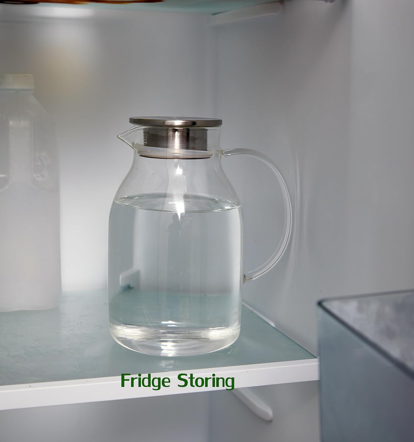 - [Premium Quality] Safe to put boiling water into it and use it on stove-top because our pitcher is made by heat resistance borosilicate glass which is lead-free, lightweight, durable and withstands temperature between 0 ℉ and 300 ℉. The ring of the lid is made by high quality silica gel BPA-free.