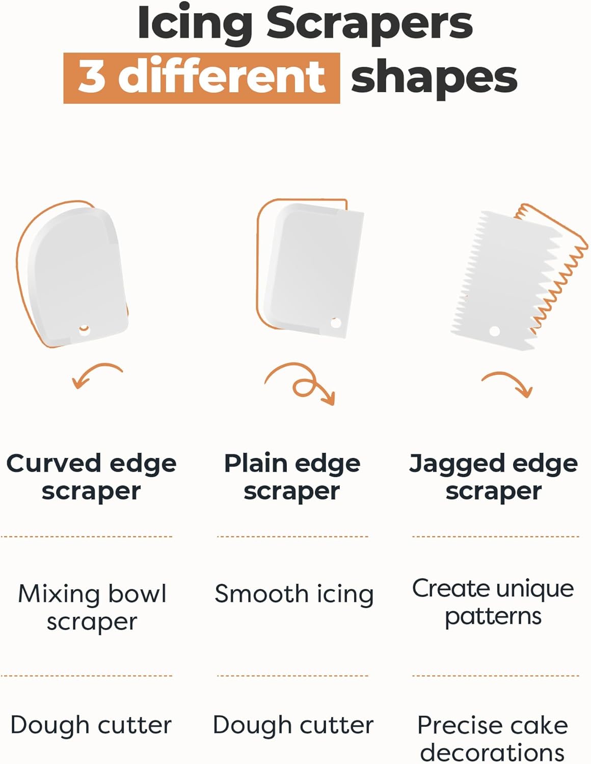 - 3 Edges of Cake Scrapers: This cake decorating kit includes 3 different icing comb scrapers, so you can make various designs on your cake. With one rounded scraper, one straight scraper, and one toothed scraper, you can easily create complex and stunning designs.