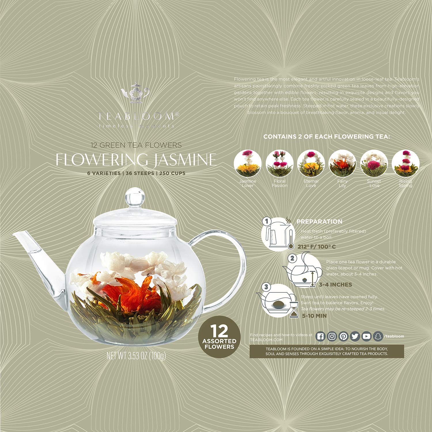 Teabloom Jasmine Flowering Tea – Hand Tied Green Tea Leaves + Jasmine Blossoms Flowering Tea Creations – Blooming Tea Gift Set – 12-Pack, 36 Steeps, Makes 250 Cups