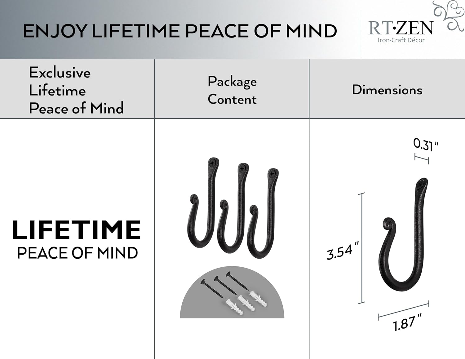 RTZEN Wall Mount Hook Set - Wrought Iron Decorative Rustic Metal Coat Hooks for Hanging - Handcrafted Classic Farmhouse Wall Mounted Black Hooks for Towel Robe or Hat Hanging - 3 Pack