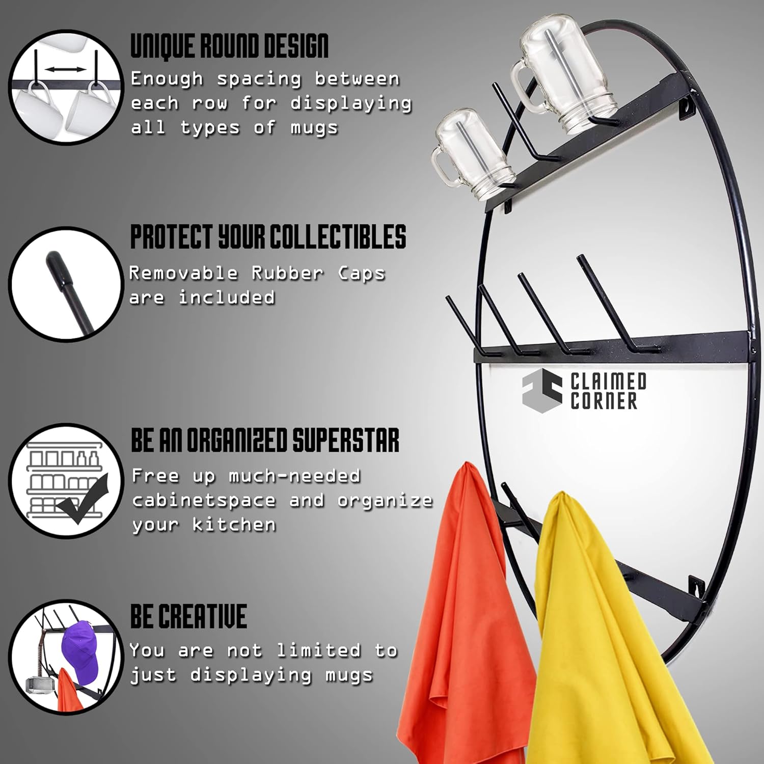 Claimed Corner Mug Rack with Sturdy Steel Frame, Matte Black Finish, Removable Rubber Caps, Wall Mounted (Round 24" x 24")