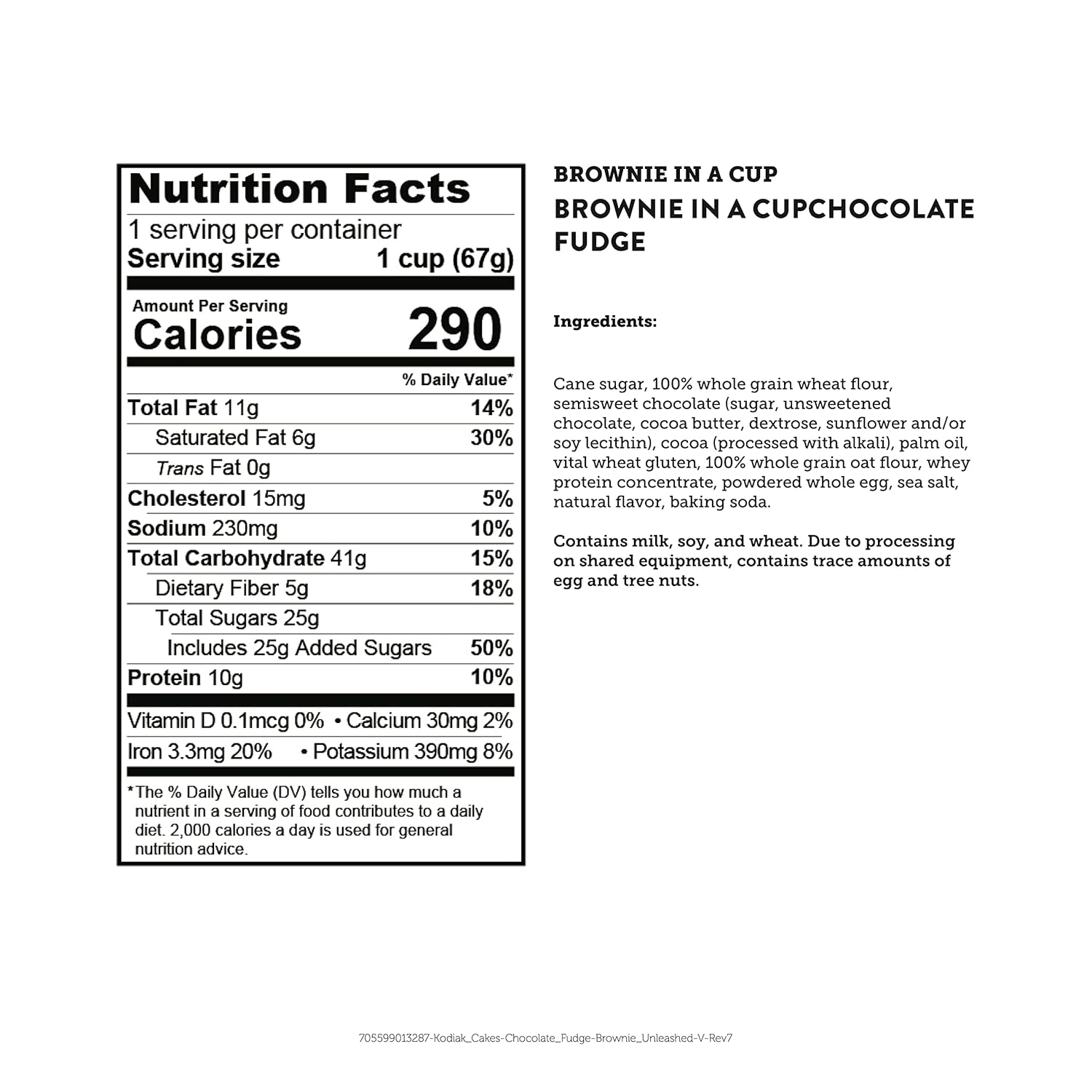 - You will receive a Pack of (12) Kodiak Cakes Chocolate Fudge Brownie in a Cup, 2.36 Ounce