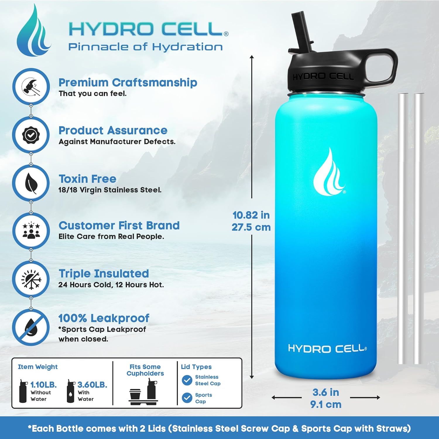 - STYLE: Purchase Includes Stainless Steel Bottle, Screw Cap (100% Airtight), Bonus Sports Cap with Straws (Cold Temp ONLY). Hydro Cell offers the largest selection of matching Paracord Handles, Bottle Boots, and Color Replacement Caps: Sold Separate, Linked Below. Customize your Hydro.