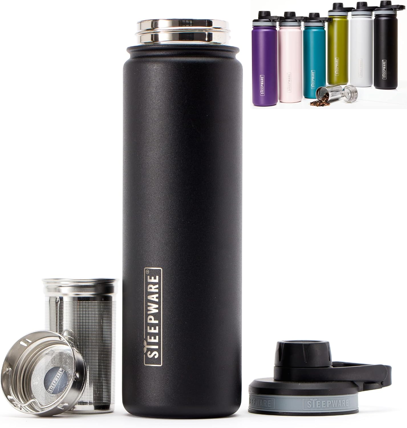 The Tea Spot Steepware Tea Tumbler and Thermos, 22oz, Tea Bottle with tea infuser for loose leaf tea or iced coffee, Sleek Double Wall Tumbler & Insulated Travel Bottle - Black