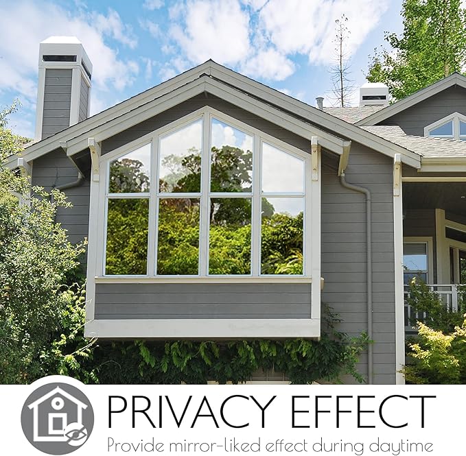 - SUPERIOR DAYTIME PRIVACY PROTECTION – Applying our window privacy film see out not in lets you see out and does not let prying eyes see in during daytime while letting natural lights in, and from the outside, the glass shows a mirror like reflective surface. NOTICE: When the inside light is stronger than the outside light at night, the house window tint CANNOT provide privacy, and the mirror reflective effect will disappear. Do remember to draw the curtains during the night.