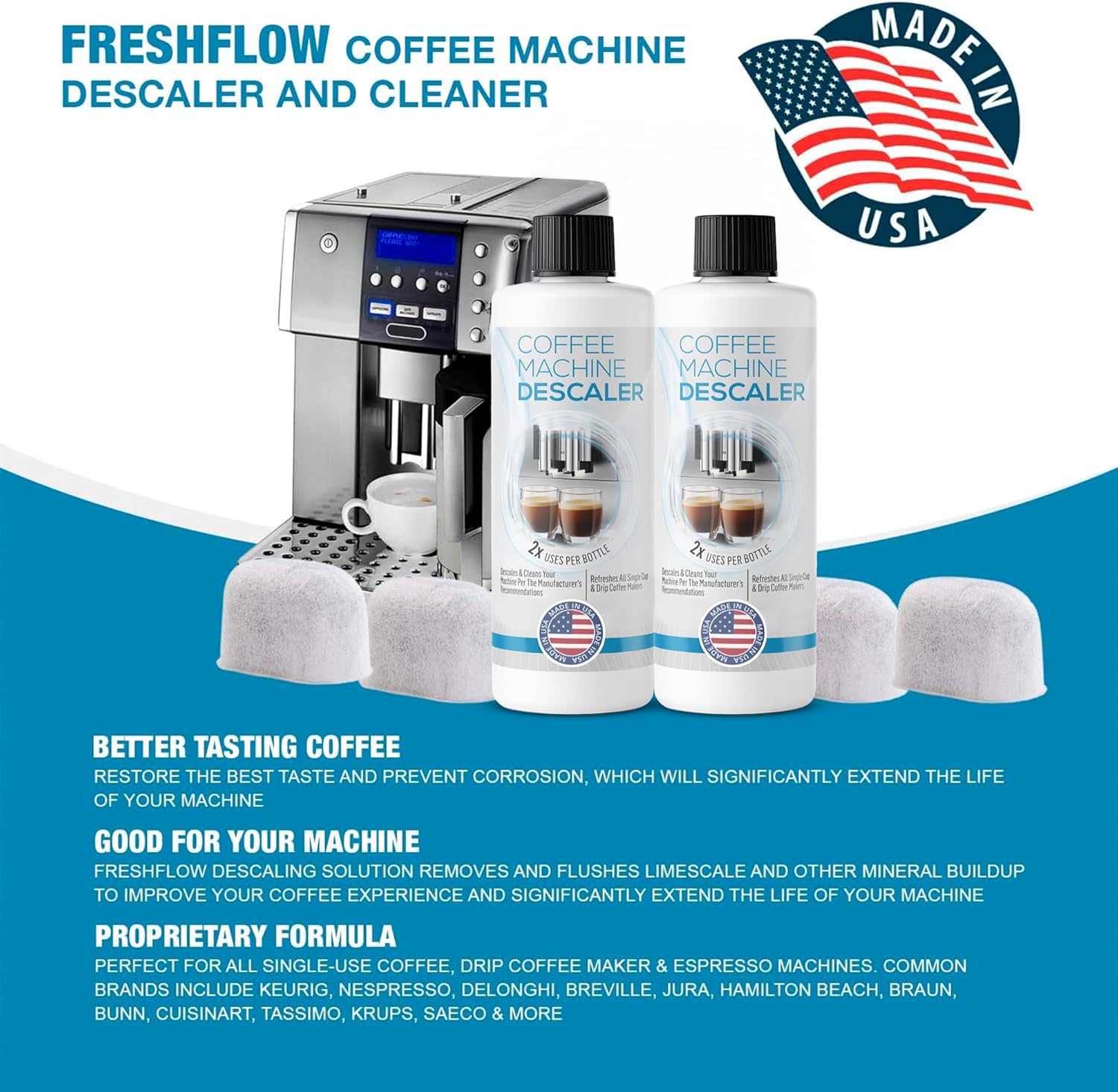 - PROPRIETARY FORMULA: FreshFlow is more than an ideal descaler compatible with Keurig coffee machines. It's also perfect for ALL single-use coffee, drip coffee maker & espresso machines. FreshFlow’s universal descaling solution is also compatible with most coffee/espresso machine brands including Keurig, Nespresso, Delonghi, Breville, Jura, Hamilton Beach, Braun, Bunn, Cuisinart, Tassimo, Krups, Saeco & more