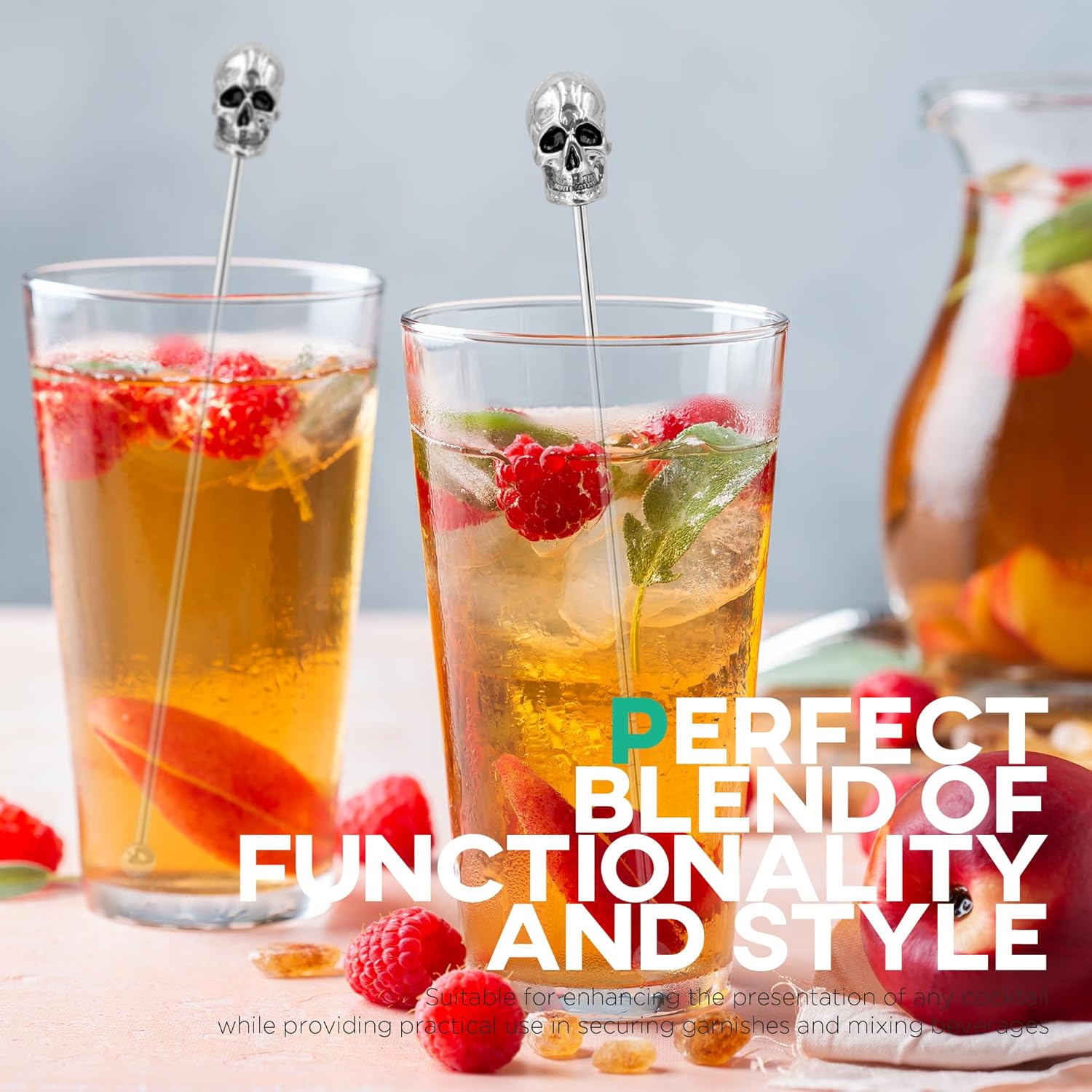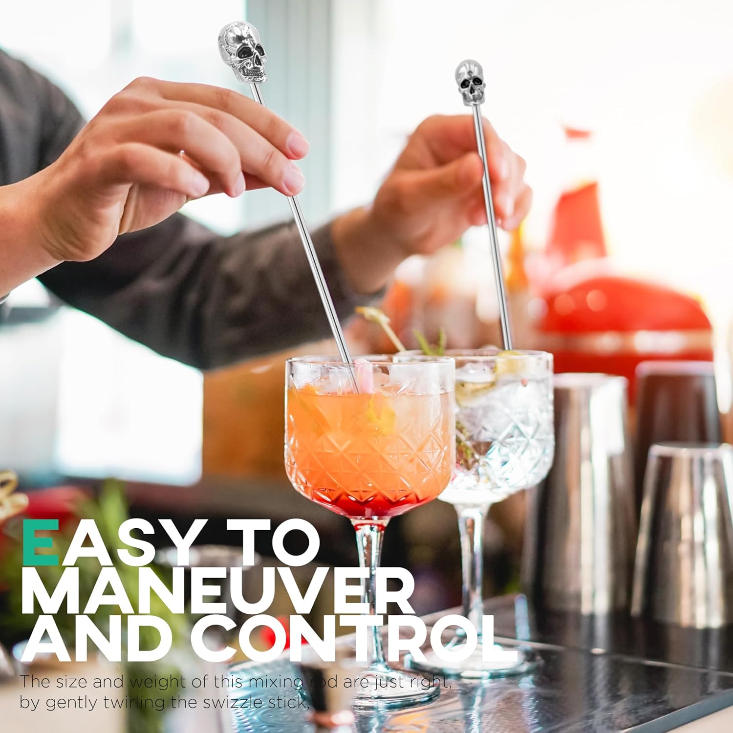 - OPERATION: The stirrer's head is adorned with a skull decoration, not only adds a touch of character to your barware but also serves as a functional handle, making it easy to maneuver and control the rod with precision. The size and weight of this mixing rod are just right, by gently twirling the swizzle stick, you can effectively blend the flavors without disturbing the ice or garnishes.