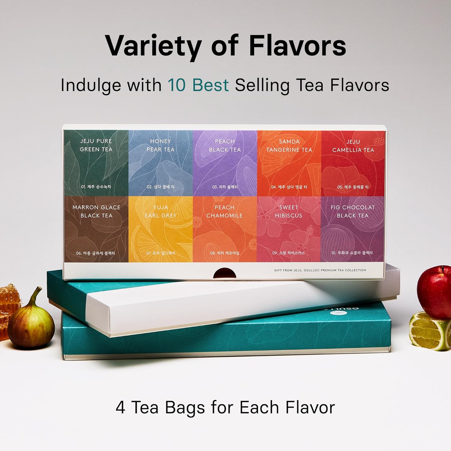 OSULLOC Premium Tea Collection (40 count, 10 flavors x 4 ea), Assorted Tea bag Sampler, Tea Gift sets for Tea lover, Self Care Gift Box, Premium Organic Pure & Blended Tea from Jeju