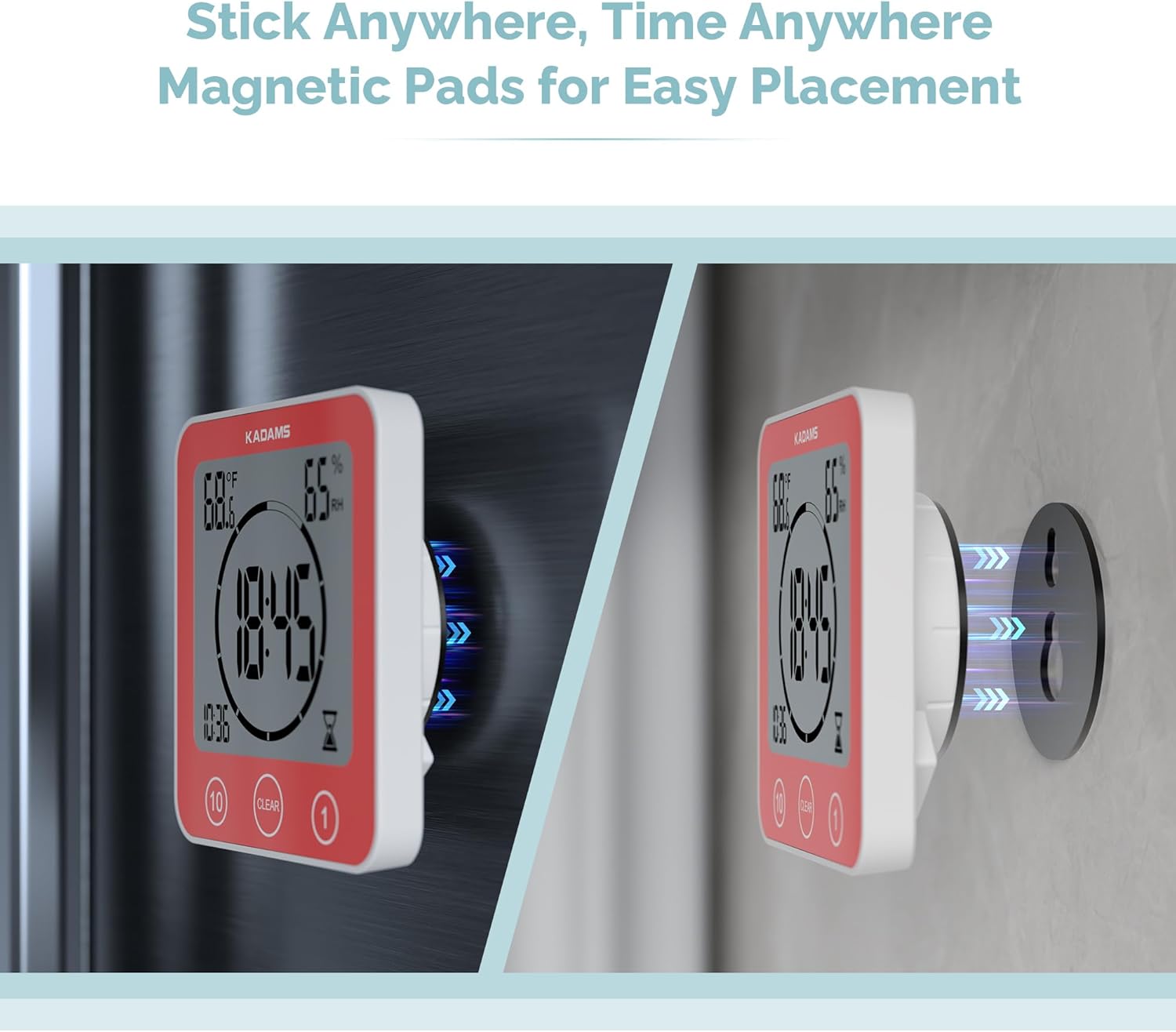 KADAMS Shower Clock Waterproof Bathroom Timer – Digital Wall Clock with Countdown, Magnetic Kitchen Clock with Temperature & Humidity, Suction Cup for Kids Shower Spa Sauna Cook Bath (Red)