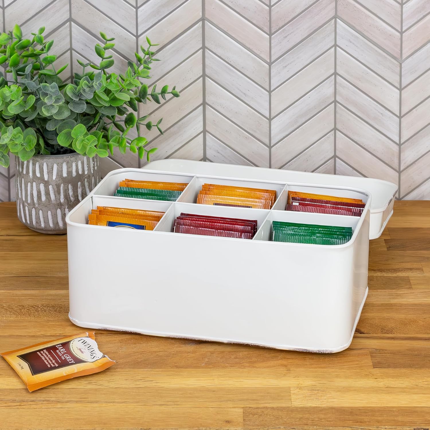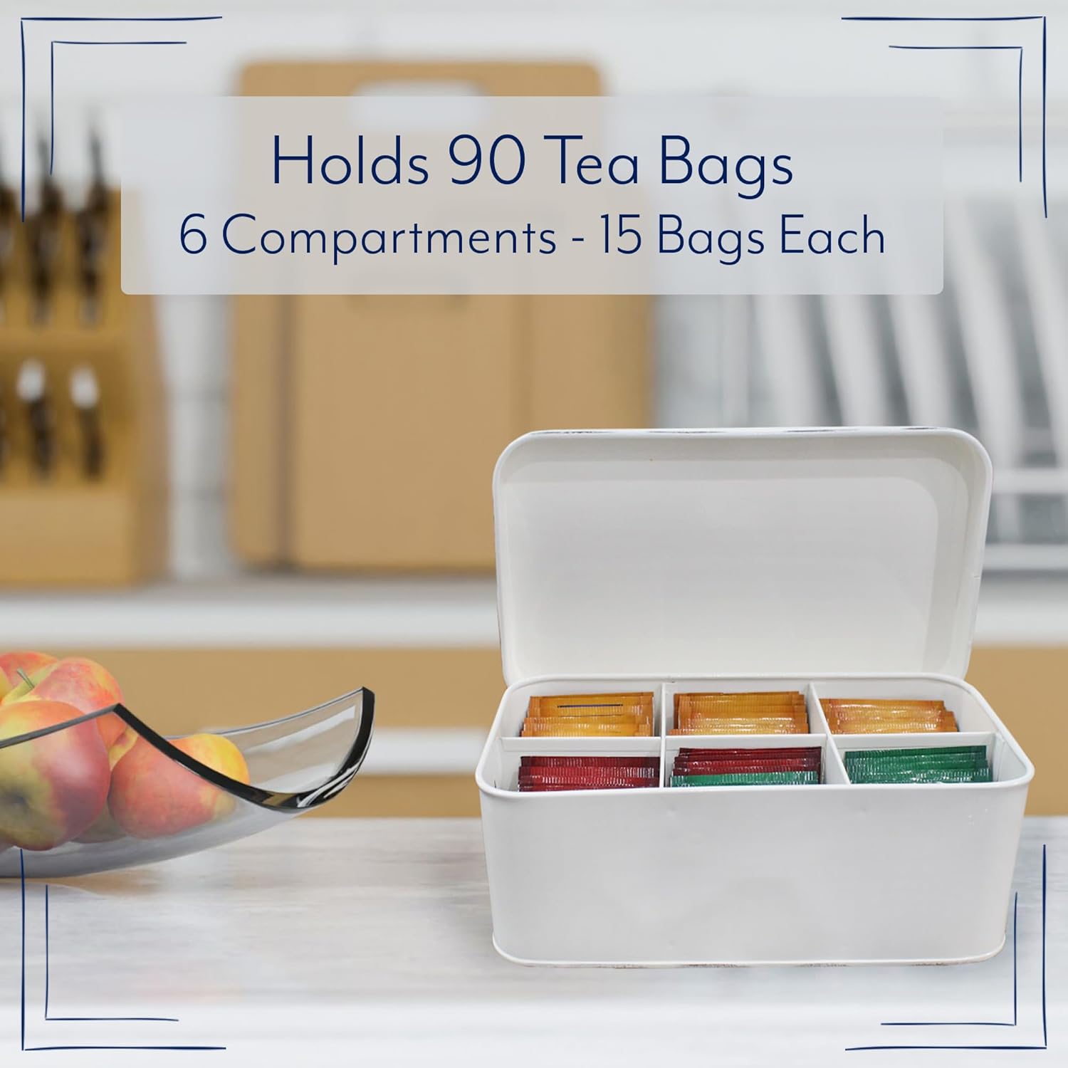 AuldHome Design Farmhouse Tea Bag Box (White), Vintage Retro Style Enamelware Tea Storage Tin
