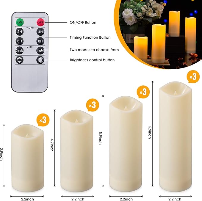Waterproof Flickering Flameless Candles, Set of 12 Battery Operated Candles (D2.2'' x H4''5''6''7"), Outdoor Indoor Candles with 10-Key Timer Remote, Long Lasting
