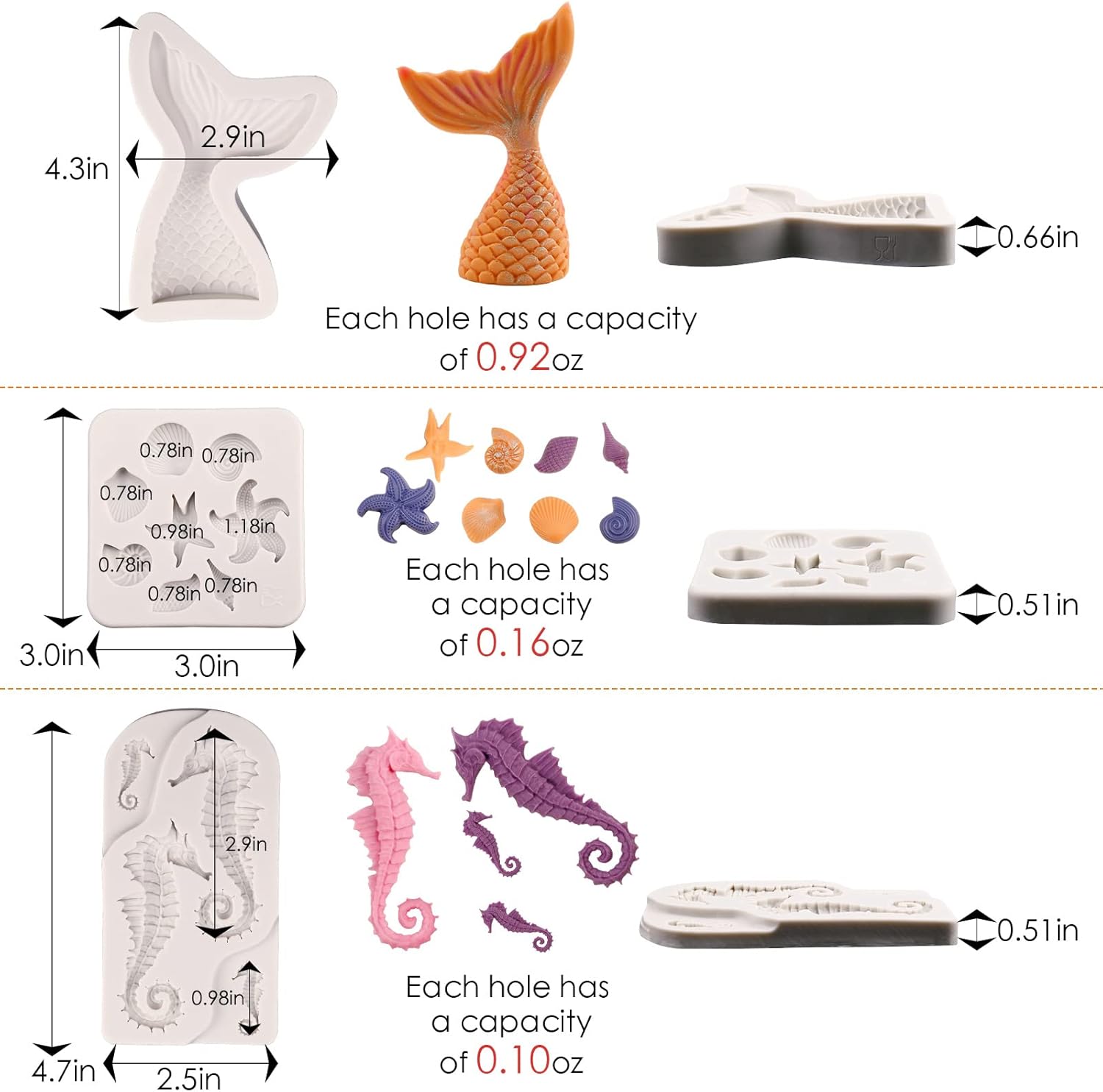 - 🐟Package contains: 1pcs mermaid tail mold,1pcs seashell conch mold, 1pcs seahorse mold, food grade silicone, BPA free