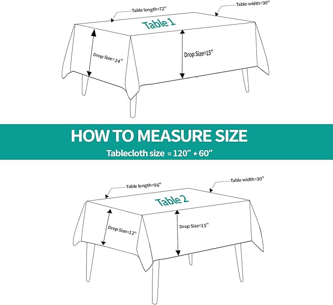 - Ideal size: The 60x120 rectangular tablecloth size is perfect for 6 foot rectangle tables, providing full coverage protection while also easily hanging down the edges to add a touch of elegance to your table