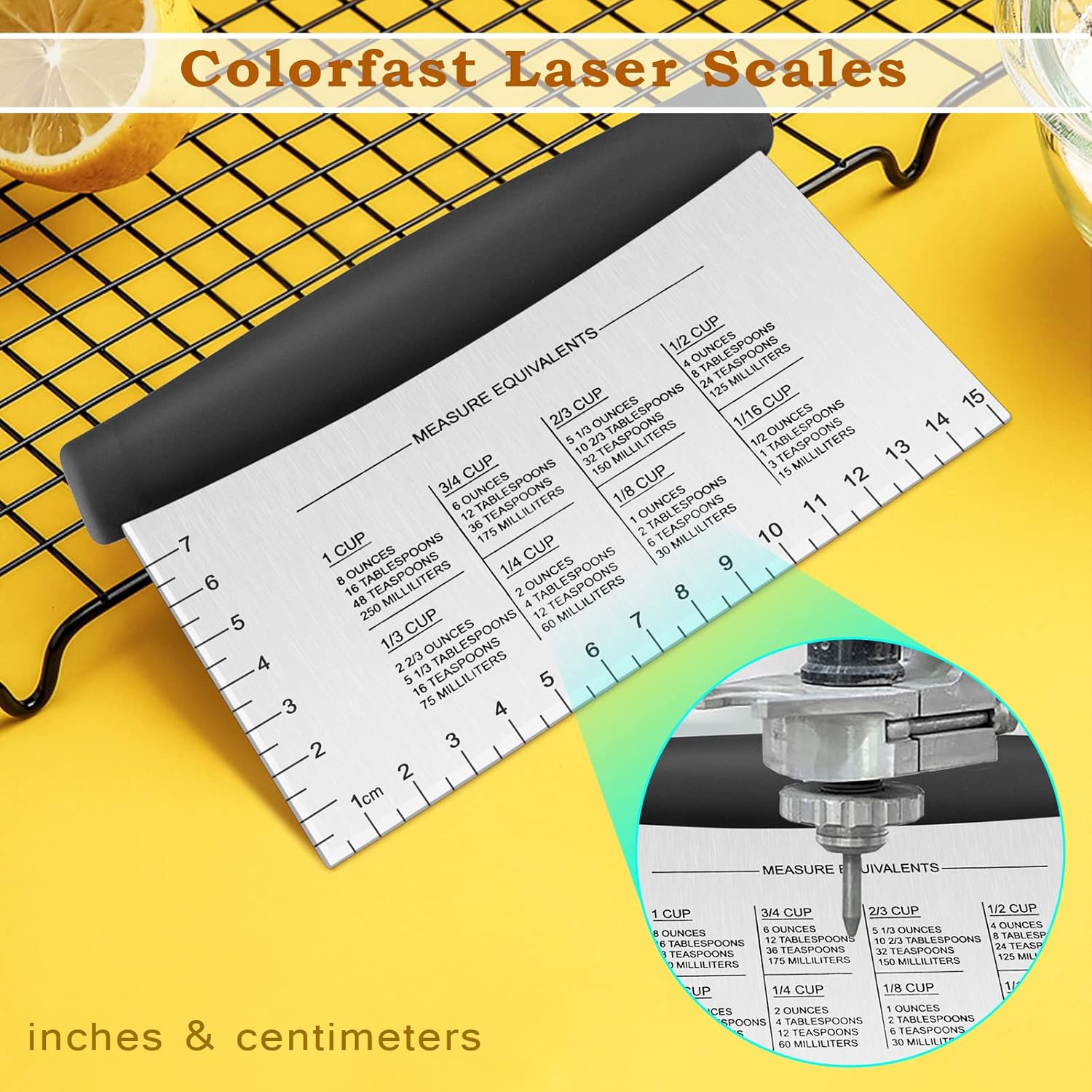 - CRAFT - Precise measurement units by inches and centimeters etched along sharp blade edge for cutting food in even portions, Beveled edge blade contoured design and MEASURE EQUIVALENTS on the back