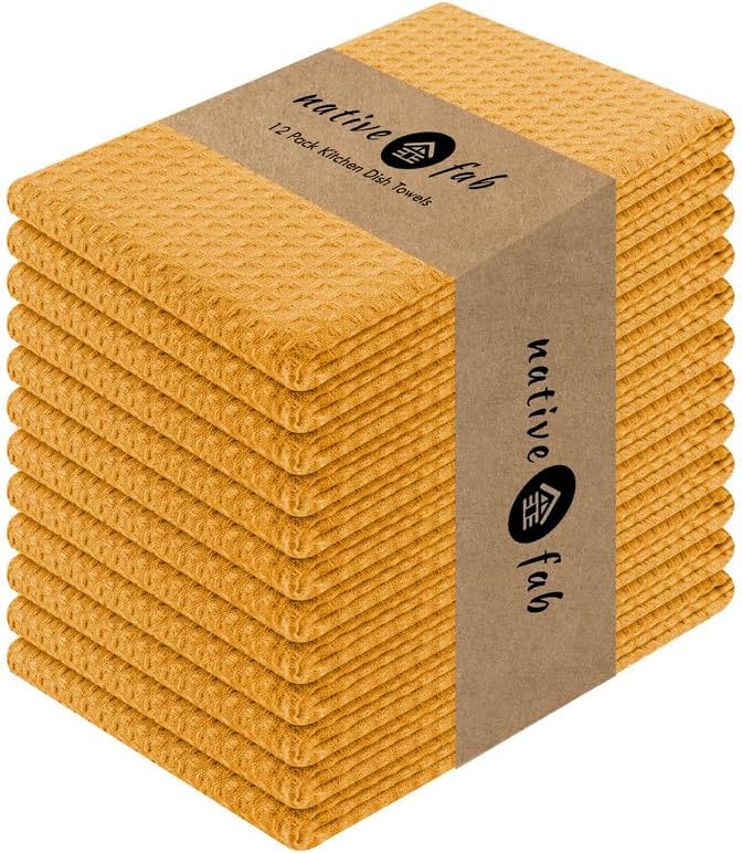 Native Fab Cotton Kitchen Towel with Hanging Loop 16x26 inches, 12-Pack, Waffle Weave Kitchen Towels for Cleaning Drying, Washcloths Soft & Absorbent Cloth Rags, Bar Towel, Dish Cloth, Mustard Yellow