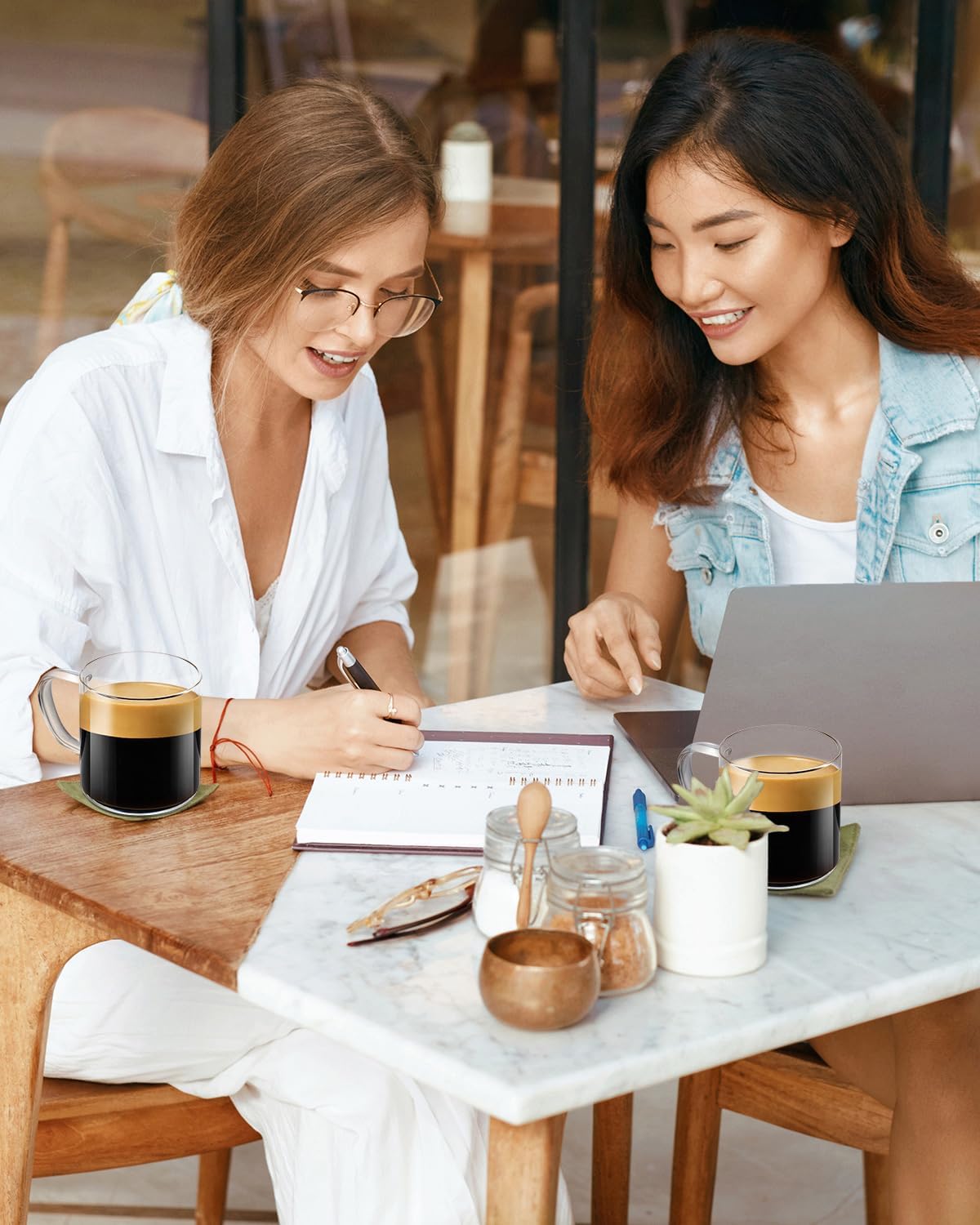 - MULTIFUNCTIONAL GLASS:Modern coffee mug gifts set,these mugs are crystal clear,light weight and the perfect size.Can be used for Capucinno cups,Lungo cups,Macchiato,Latte,Espresso cups,Demitasse cups,Tea,Smoothie,Drinking Glasses,Beers,Hot Chocolate,Mulled Cider and Juice,Perfect for hot or cold Drinks.