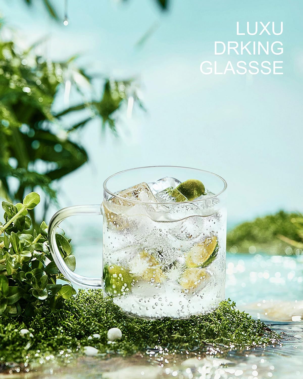 LUXU Glass Coffee Mugs Set of 4,14 oz Clear Coffee Cups,Hand Blown&Seamless Design,Heat Resistant and Explosion-Proof,Lightweight Tea Mugs with Anti Scald Handle Ideal for Home,Cafe