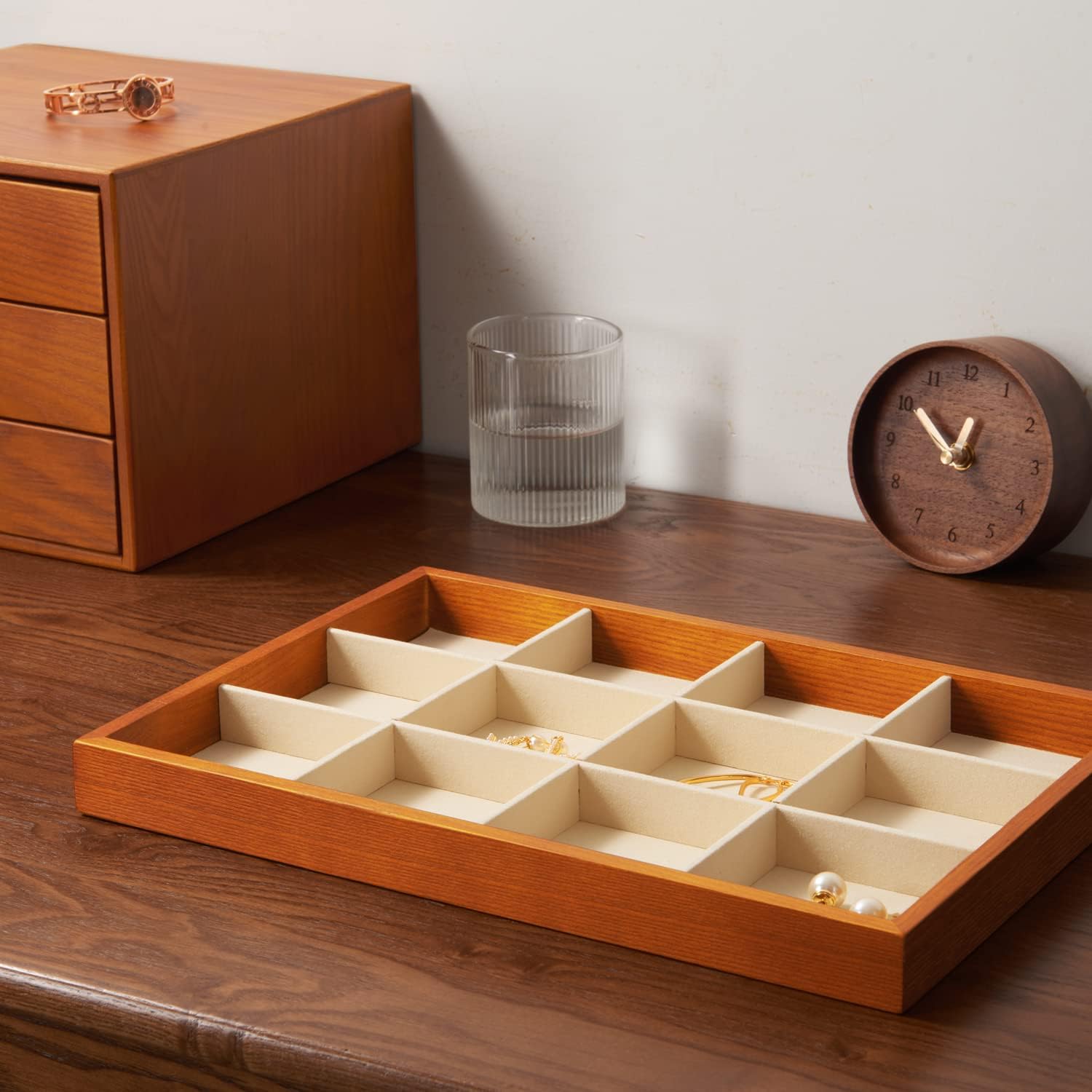 - ★Place your earrings,bracelet,bangle and watch in convenient compartments and store them in orderly fashion, The high-grade wood and microfiber will make jewelry more eye-catching.