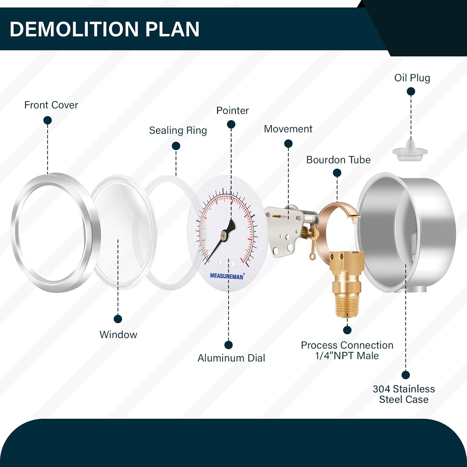 MEASUREMAN 2-1/2inch Dial Size, Liquid Filled Pressure Gauge, 0-200psi/kpa, 304 Stainless Steel Case, 1/4 inchNPT Lower Mount