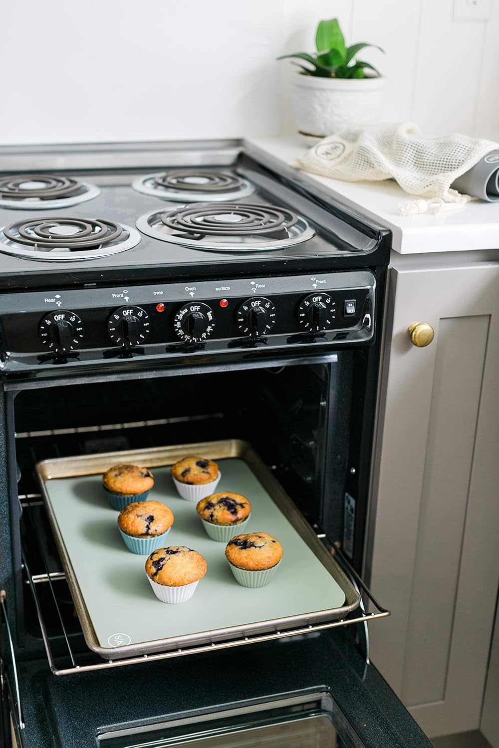 - INCLUDES 12 food-grade silicone baking cups in four colors,3 Navy, 3 Dusty Blue, 3 Sage Green, 3 Designer White, packaged in a gift worthy The Silicone Kitchen reusable cotton mesh produce bag
