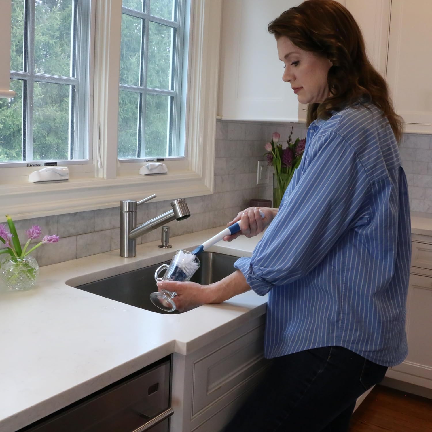 - Versatile Glassware Scrubber: This kitchen brush works especially well at cleaning corners and curves of tall, rounded glassware. It’s great for coffee mugs, travel mugs, water bottles, beer glasses, carafes, and more