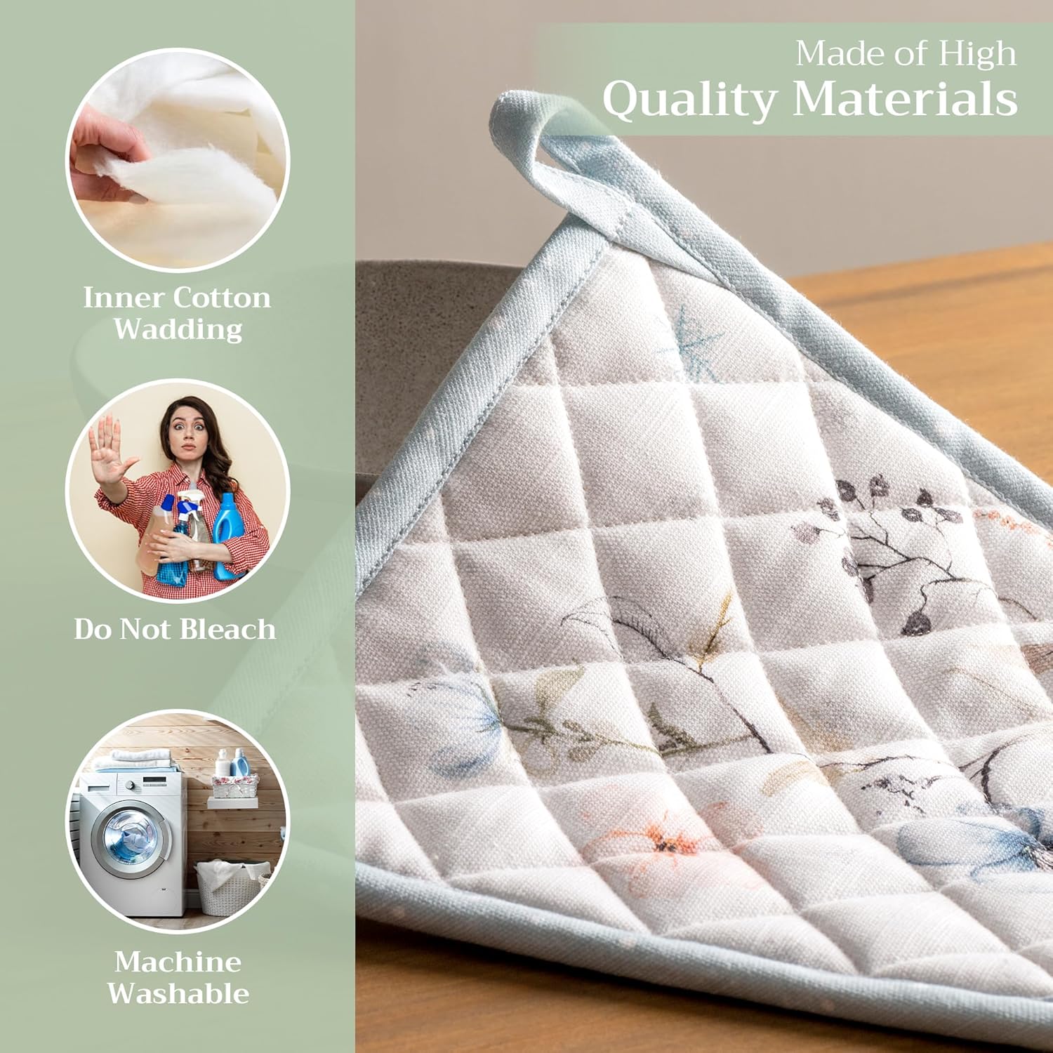 - 100% Quilted cotton: Made from premium quilted cotton, our pot holder ensures safe handling of hot pans or dishes. The soft, durable build provides excellent heat resistance and grip—perfect for everyday cooking and baking needs