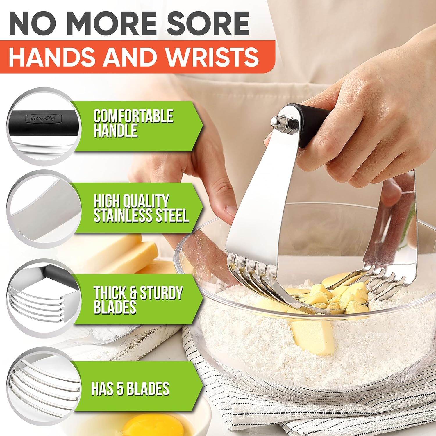 Spring Chef Dough Blender, Top Professional Pastry Cutter with Heavy Duty Stainless Steel Blades, Large Size, Black