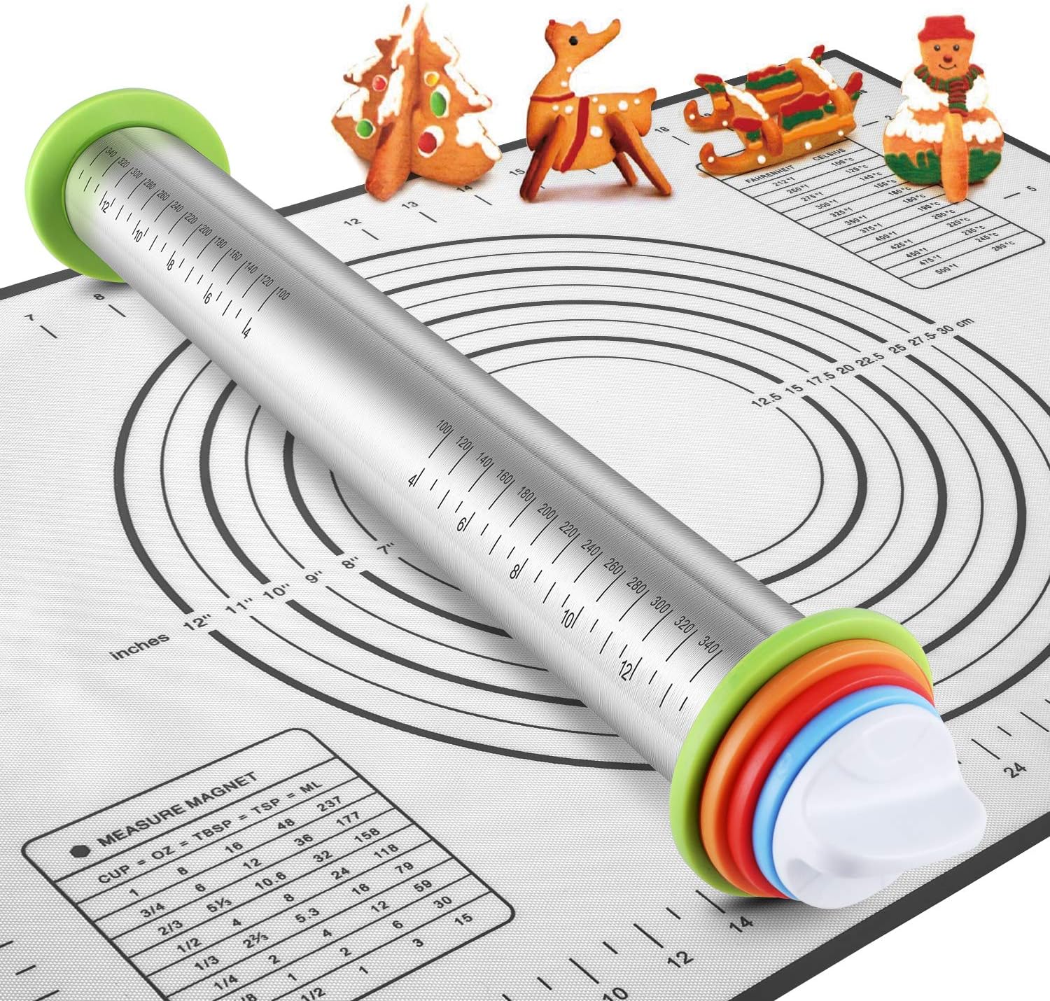 Rolling Pins, Stainless Steel Dough Roller, Rolling Pin and Silicone Baking Pastry Mat Set, Adjustable Rolling Pin with Thickness Rings for Baking Dough, Pizza, Pie, Pastries, Pasta, Cookies(Black)