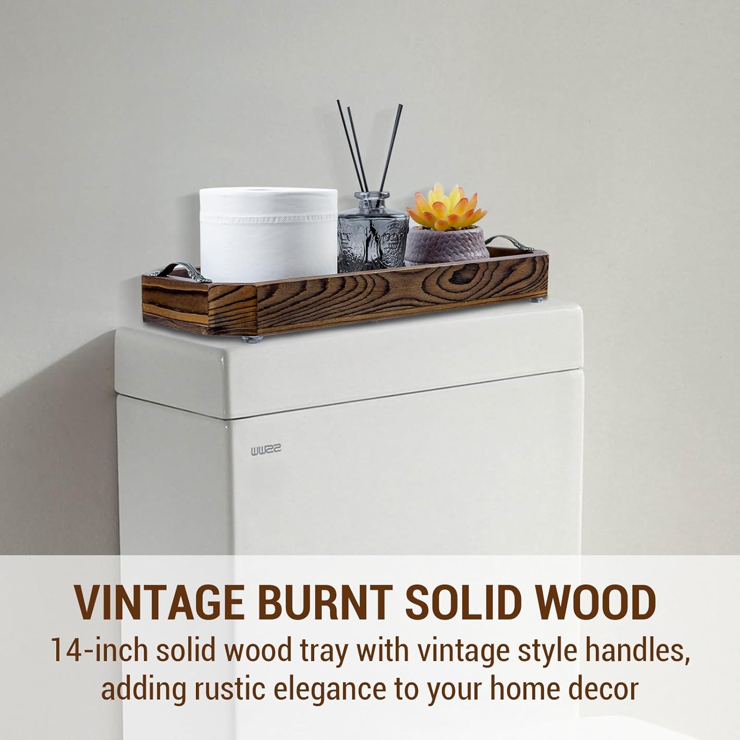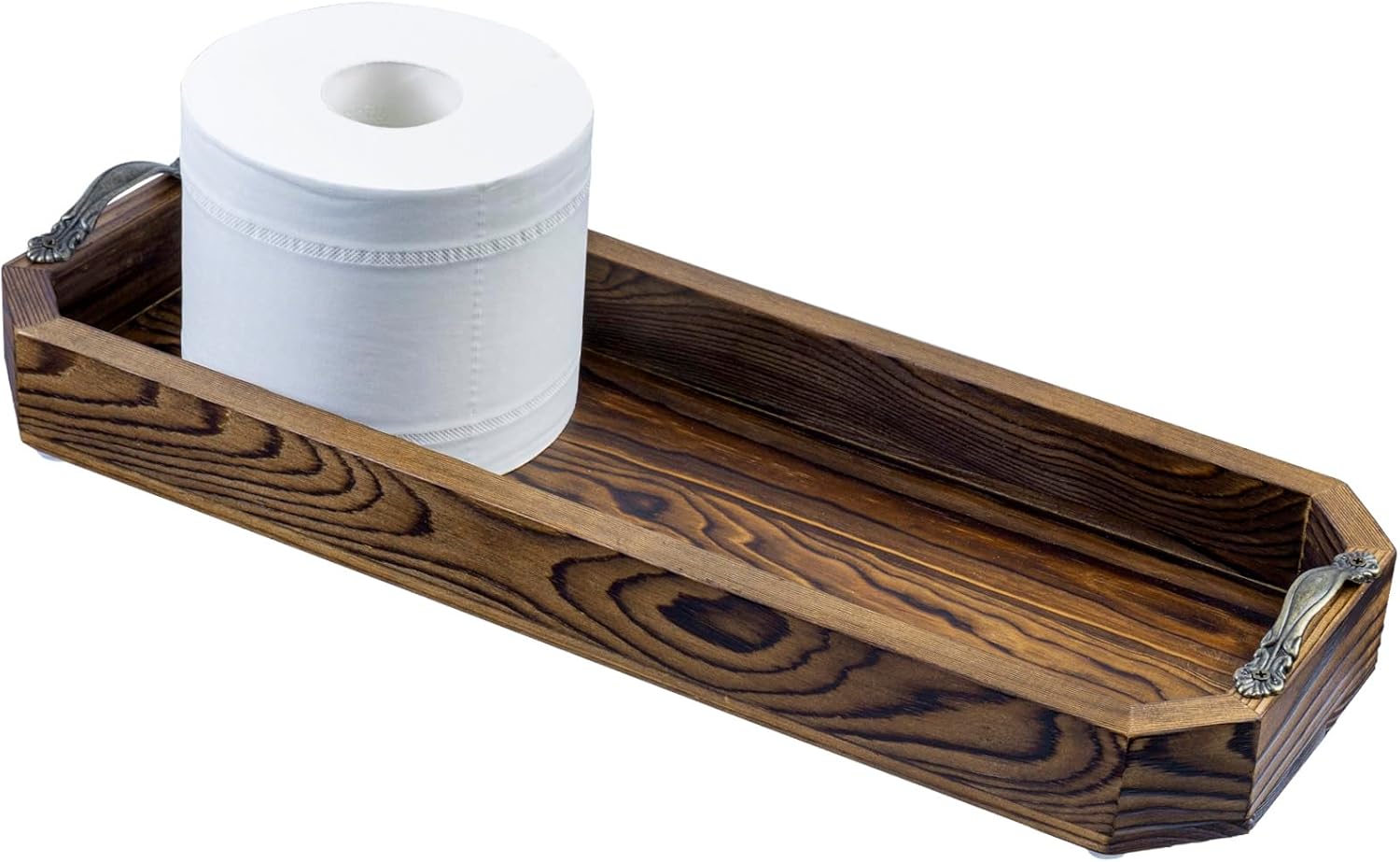 MyGift Wooden Vanity Tray, Rustic Burnt Solid Wood Toilet Tank Tray - Decorative Octagonal Cosmetic Organizer with Antique Metal Handles