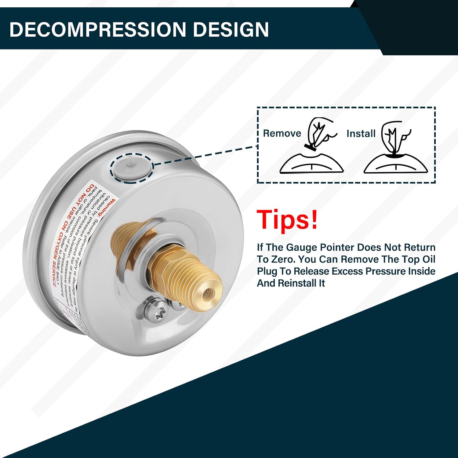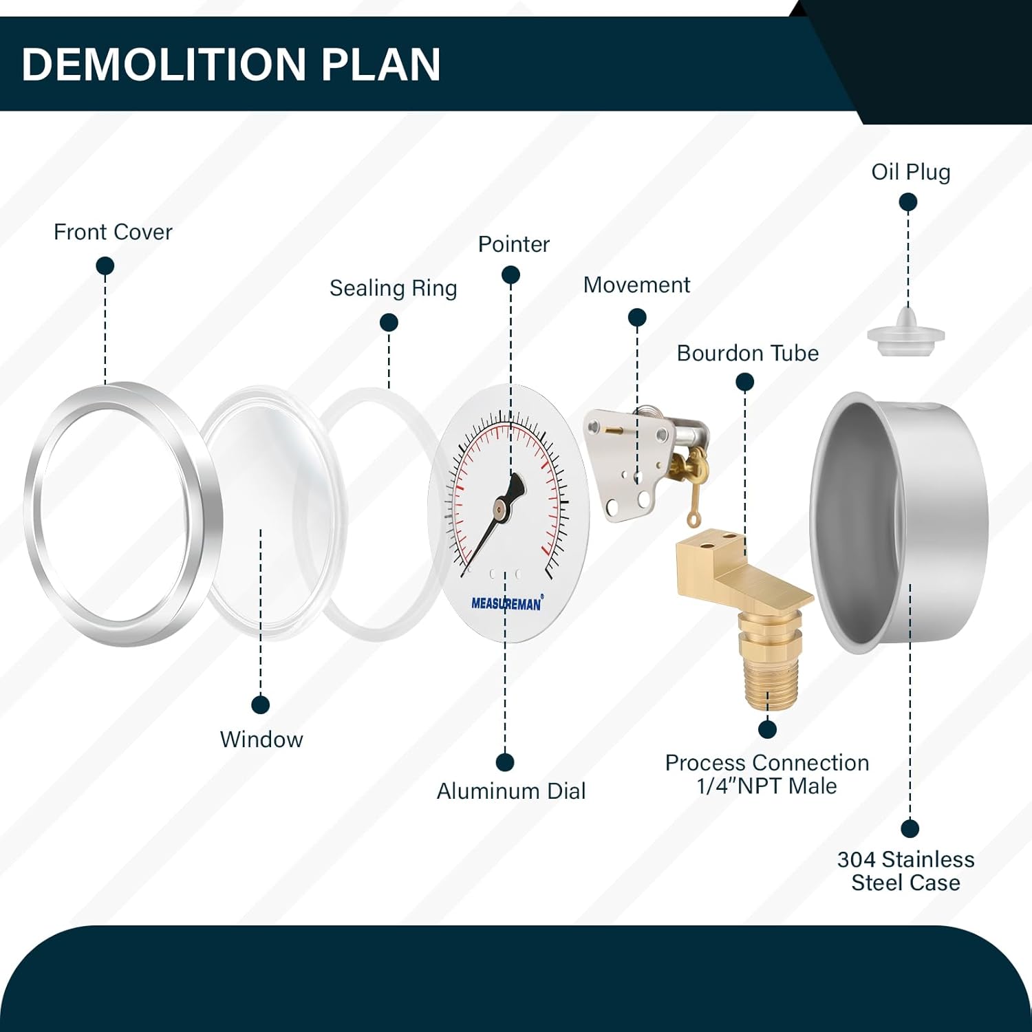 MEASUREMAN 2-1/2 inch Dial Size, Liquid Filled Pressure Gauge, 0-300psi/2000kpa, 304 Stainless Steel Case, 1/4 inch NPT Back Mount
