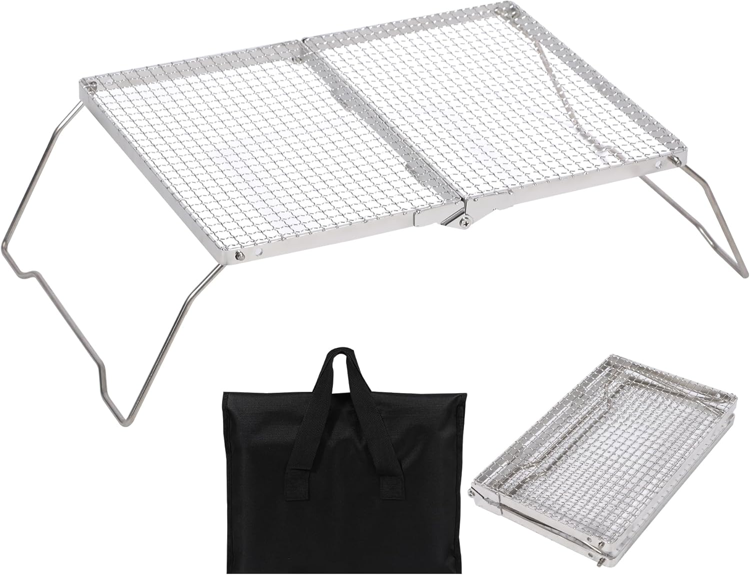 - Foldable Design: The fire grill’s legs can angle out for stability and help to take the weight. In addition to foldable legs, it can also be folded in half from the middle. The campfire grill grate with a storage bag is essential gear for camping, backpacking, hiking, and more.