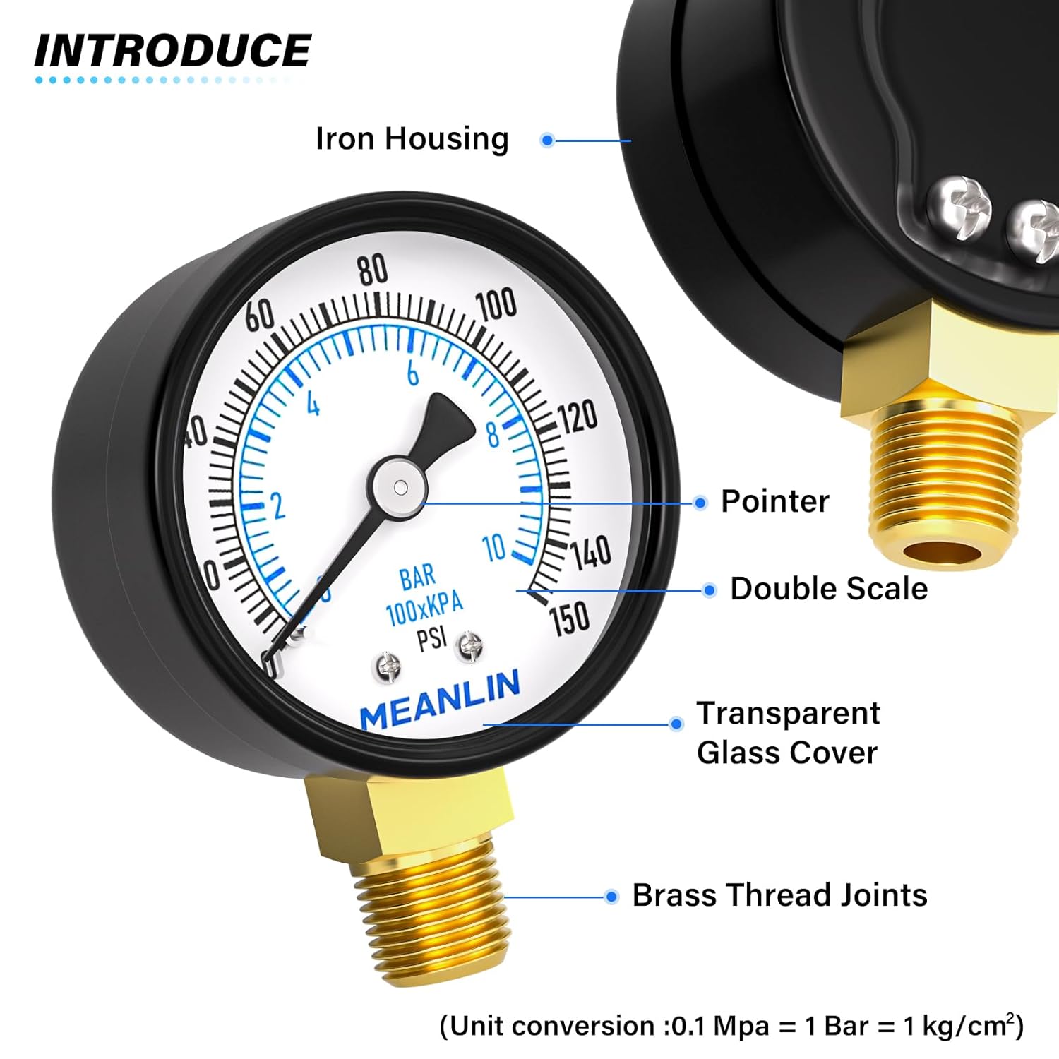 MEANLIN MEASURE 0-150Psi 2" DIAL FACE 1/4" NPT Well Pump Pressure Gauge, with 1/2" NPT and 3/8" NPT Hex Bushing, 3-2-3% Accuracy, Lower Mount