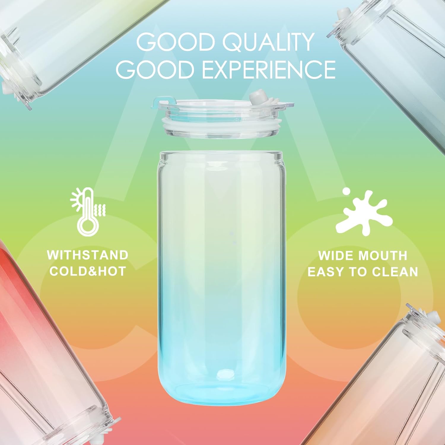 - 【BOTH HOT AND COLD】 high borosilicate glass manufacturing, cold and hot drinks can be stored. The lid has an air vent to accommodate both static and carbonated drinks. 3mm thick high borosilicate glass quality, not easy to break. More crystal clear than ordinary glass, inkjet technology does not fade.