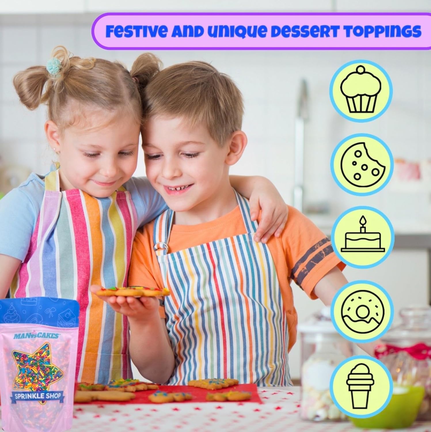 - HAND-BLENDED BY MASTER SUGAR ARTISTS: Manvscakes brand is proud to tell you that our cake, cupcakes, cookies, and dessert sprinkles or toppings are carefully hand-blended by master sugar artists that provide you with the best and unique sprinkle mix. Each pack of our festive and cheerful sprinkles has large, small, hard, and soft pieces of candy mix (not recommended for children under three), offering perfect toppers or frosting.
