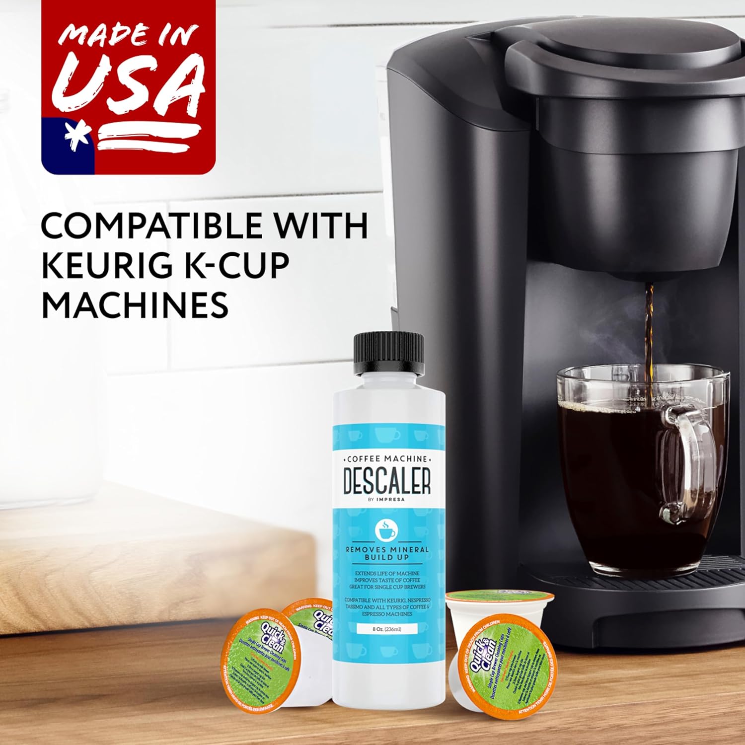 IMPRESA Coffee Machine Descaler & Cleaning Bundle - Compatible with Keurig K-Duo & K-Cup Brewers - 8 Oz Descaling Solution & 4 Maintenance Pods - Coffee Machine Cleaning & Pot Care Kit