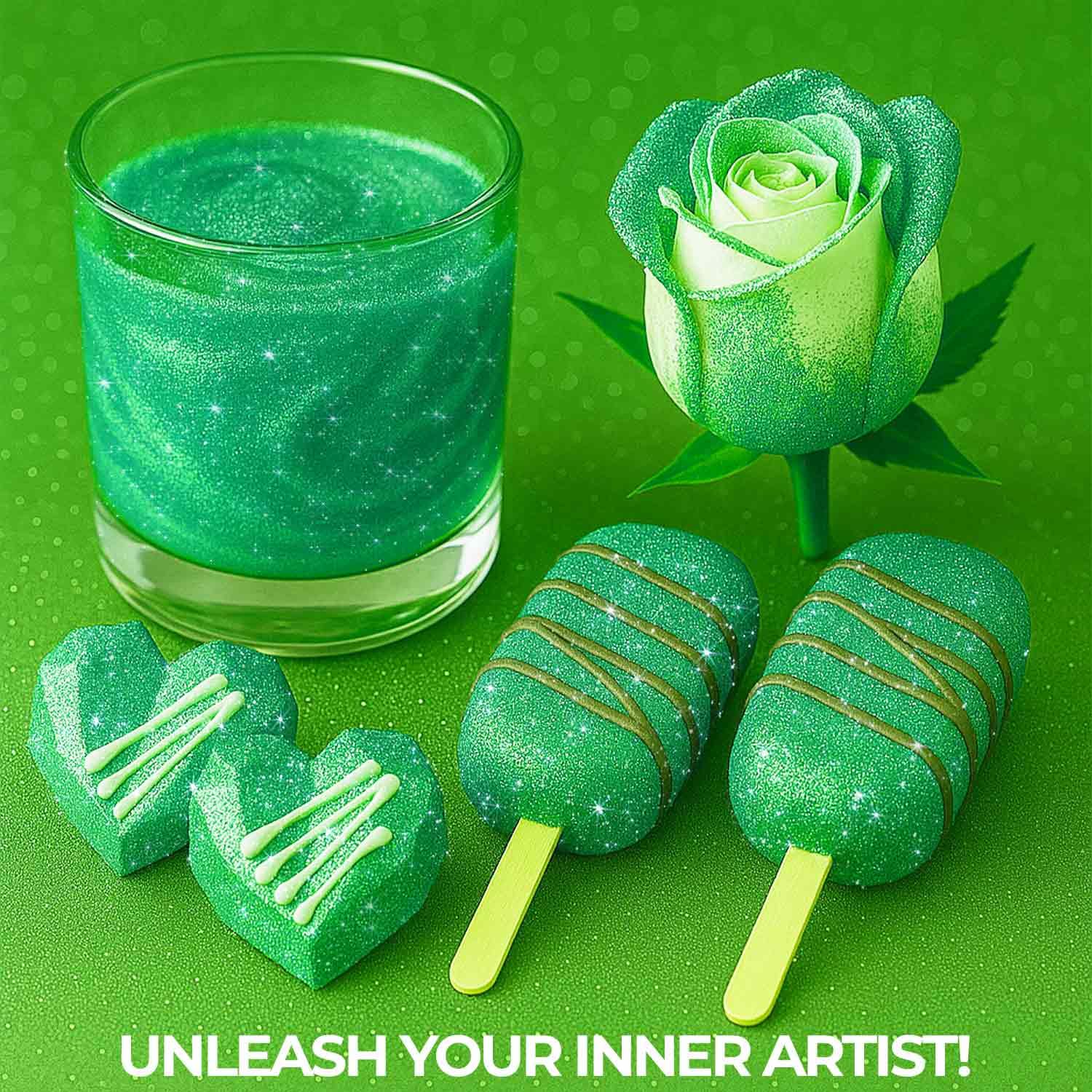 - 𝗘𝗗𝗜𝗕𝗟𝗘 𝗚𝗟𝗜𝗧𝗧𝗘𝗥 𝗙𝗢𝗥 𝗗𝗥𝗜𝗡𝗞𝗦 Glam up your desserts with edible glitter for cakes or bring sparkle to drinks using our edible glitter for cocktails. Our green glitter is made from premium, food-safe ingredients including tasteless edible and green. This green edible glitter is the perfect finishing touch for baking, drinks, and all your cake decorating needs—guaranteed to wow at any event.