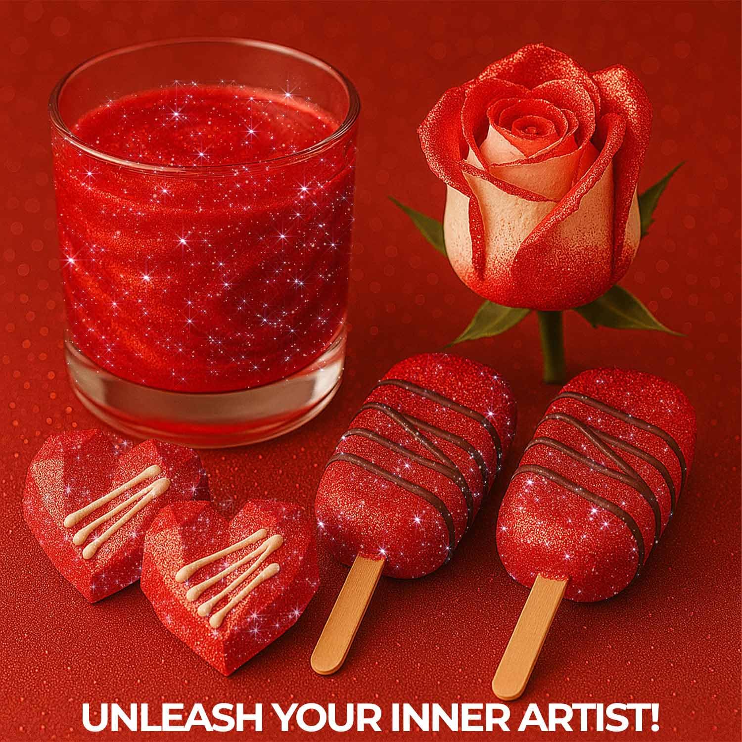 - 𝗘𝗗𝗜𝗕𝗟𝗘 𝗚𝗟𝗜𝗧𝗧𝗘𝗥 𝗙𝗢𝗥 𝗗𝗥𝗜𝗡𝗞𝗦 Glam up your desserts with edible glitter for cakes or bring sparkle to drinks using our edible glitter for cocktails. Our red glitter is made from premium, food-safe ingredients including tasteless edible and red. This red edible glitter is the perfect finishing touch for baking, drinks, and all your cake decorating needs—guaranteed to wow at any event.
