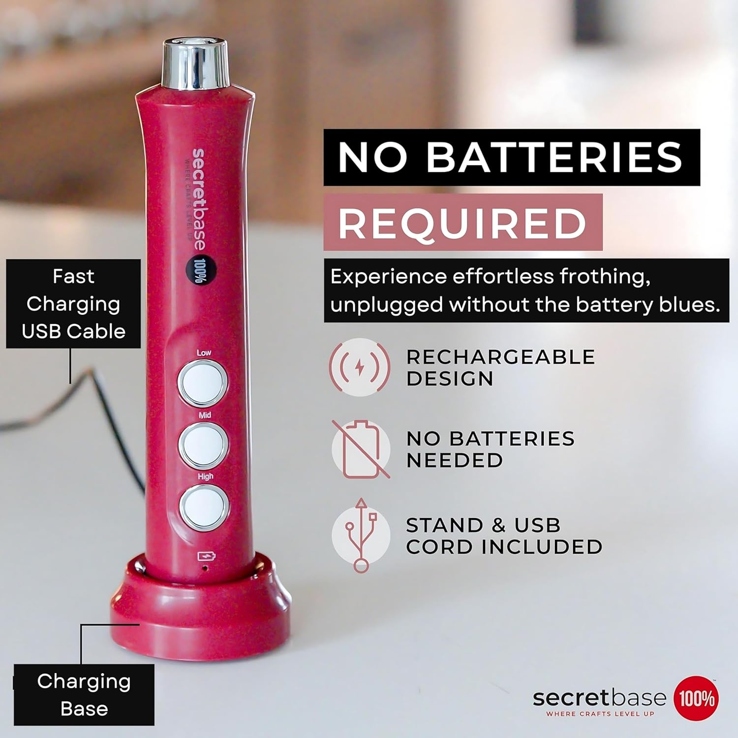 - Rechargeable Frother: Forget AA battery operated coffee stirrers that stop working after 2-3 months. Our rechargeable frother saves hassle and the cost of batteries! Plug it into your wall charger, or computer level up your morning coffee anywhere, with SecretBase 100%.