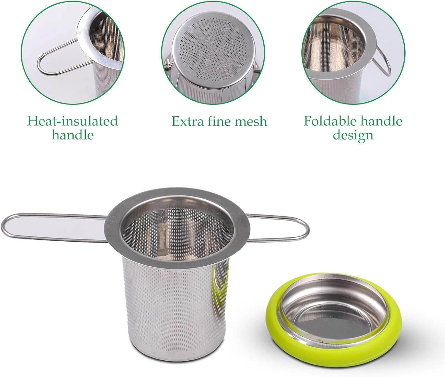 Fenshine Tea Infuser Stainless Steel Tea Strainer Folding Handle Tea Filter Extra Fine Mesh Strainer Brewing Basket with Lid for Loose Leaf Tea (Green)