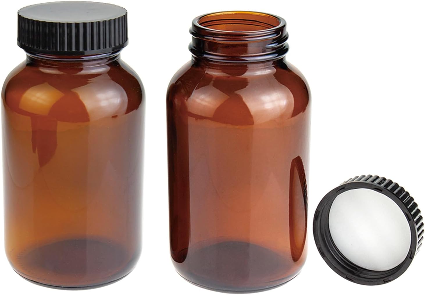 Wide Mouth Packer Bottle, Amber Glass, 250 ML (8.3 OZ) Capacity with 45-400 Black Polyethylene Screw Cap Lined PE Septa, Package of 24 Units