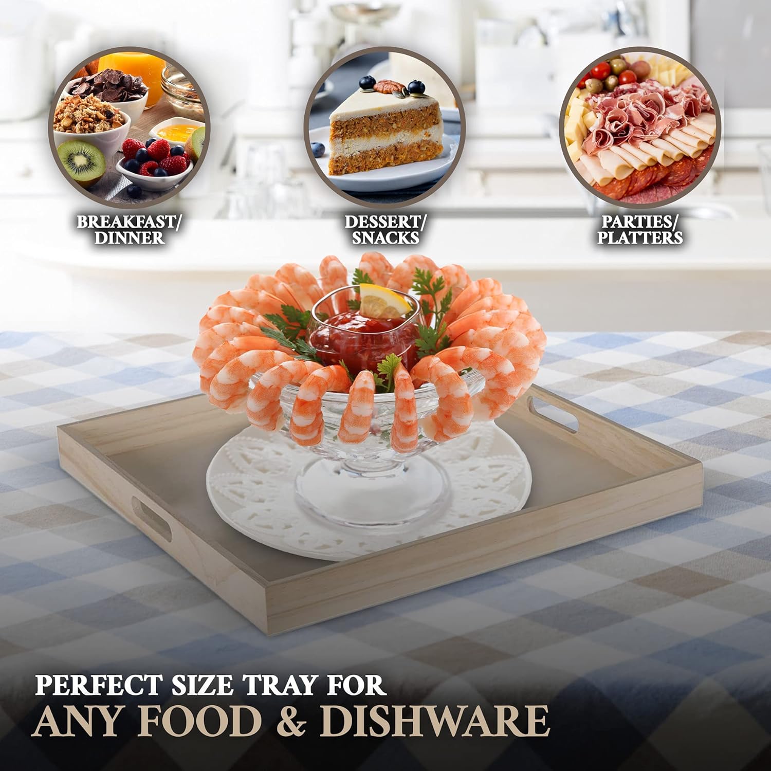 - ALL ABOUT CONVENIENCE: Our Wooden serving trays are designed for both stylish storage and effortless presentation. The trays stack into each other, making it simple to store without taking up much space. The raised edges not only add a touch of elegance but also ensure seamless serving, and no dripping off the sides making hosting a breeze. The wood is also easy to clean.