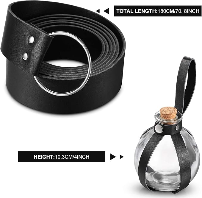 - Materials: the large round spherical bottle is made of thick glass, while the attached medieval style belt is handmade with artificial leather that has been tanned and treated, this set of carefully crafted glass bottle will add an adorable and retro touch to your costume and home decor