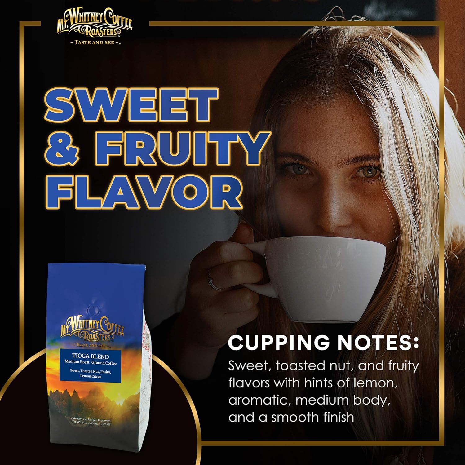 - SWEET AND FRUITY FLAVOR - Aromatic, medium bodied, with a smooth finish. Our Tioga Blend ground coffee boasts of sweet, toasted nut, and fruity flavors with notes of lemon citrus.