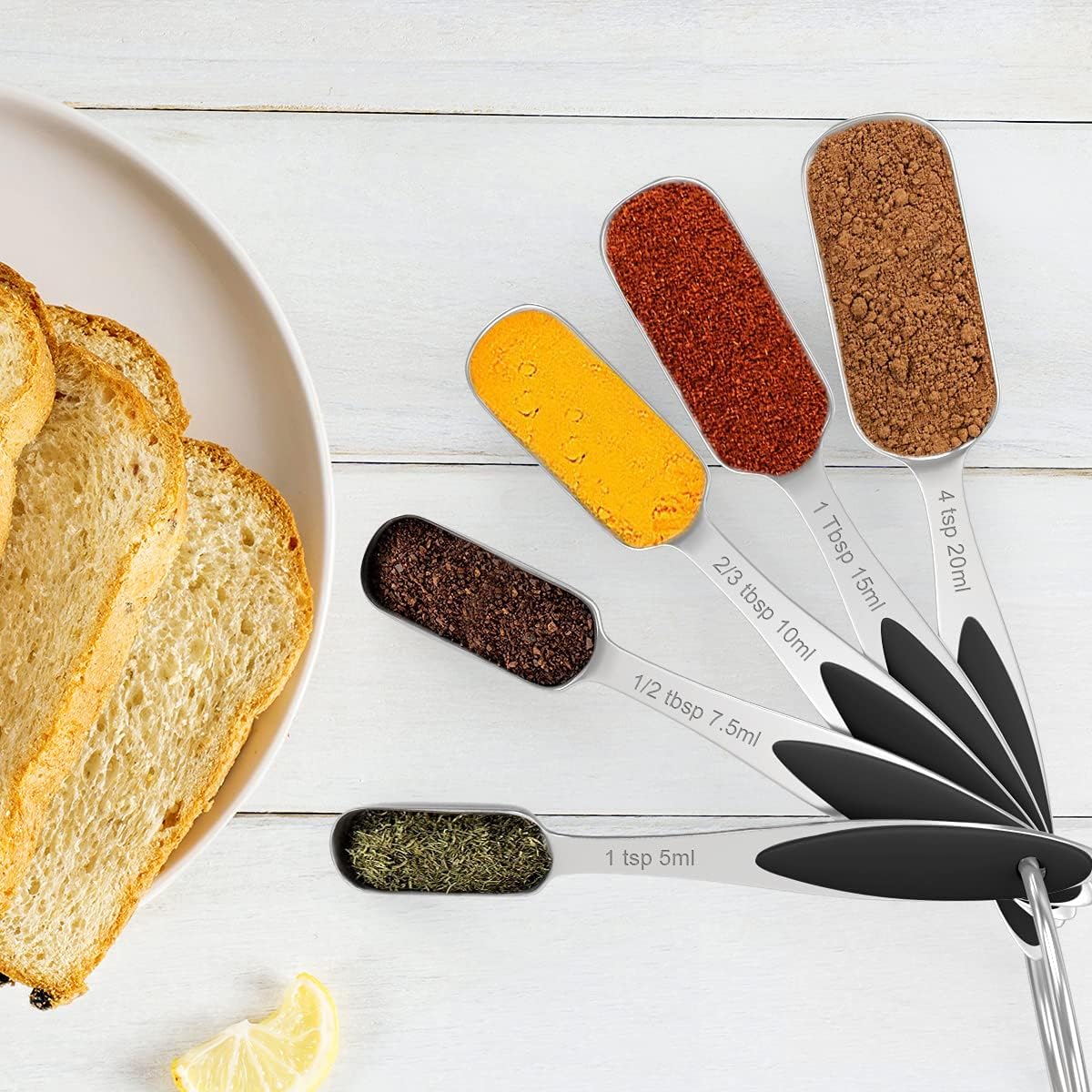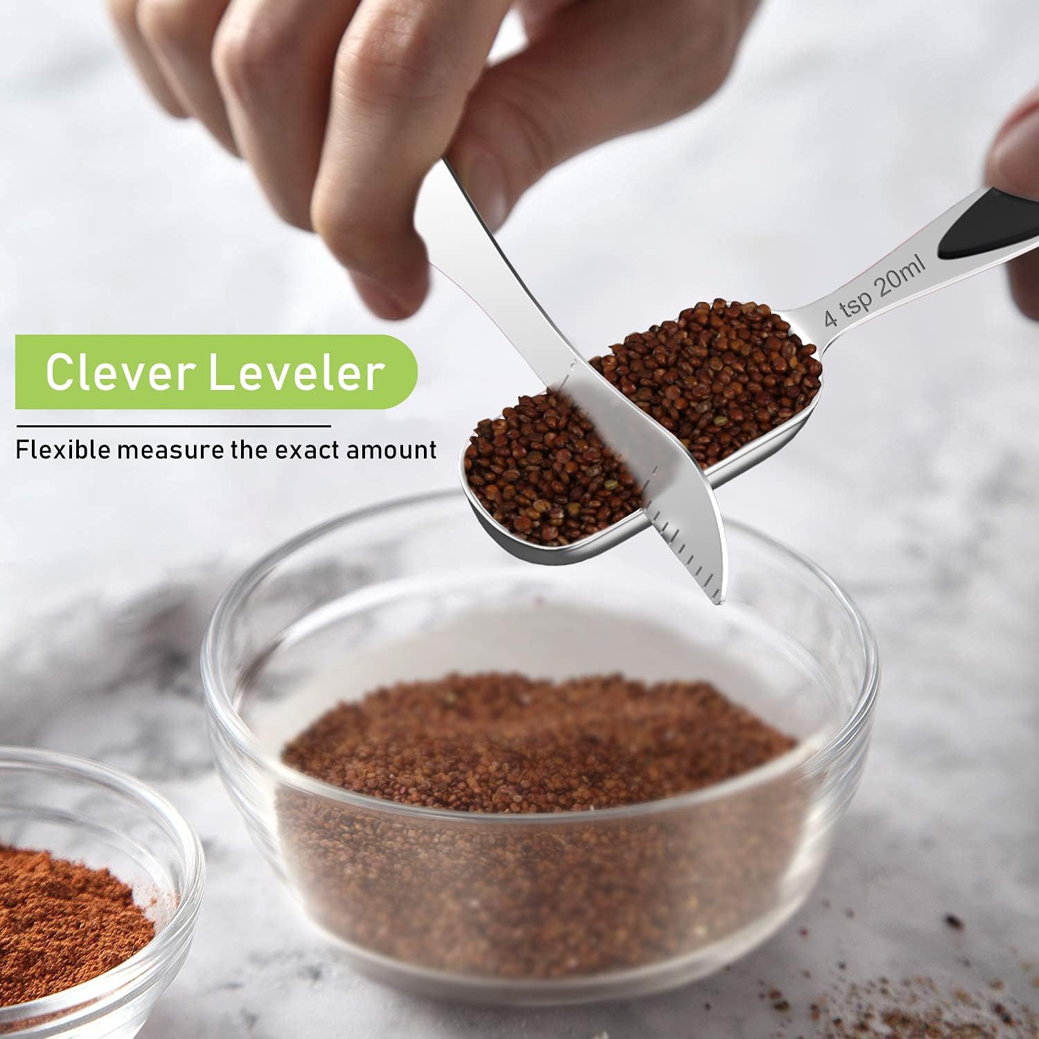 - CONVENIENT TO USE: The rectangular design of the measuring spoon is slim and narrow to fit into spice jars. You won't need to shake spices onto the spoon so you will save more and waste less of your spices and also make your kitchen clean and neat. The leveler is designed for removing excess amount of ingredients, so that you can cook more accurately and hygienic, and the whisk is great for mixing.