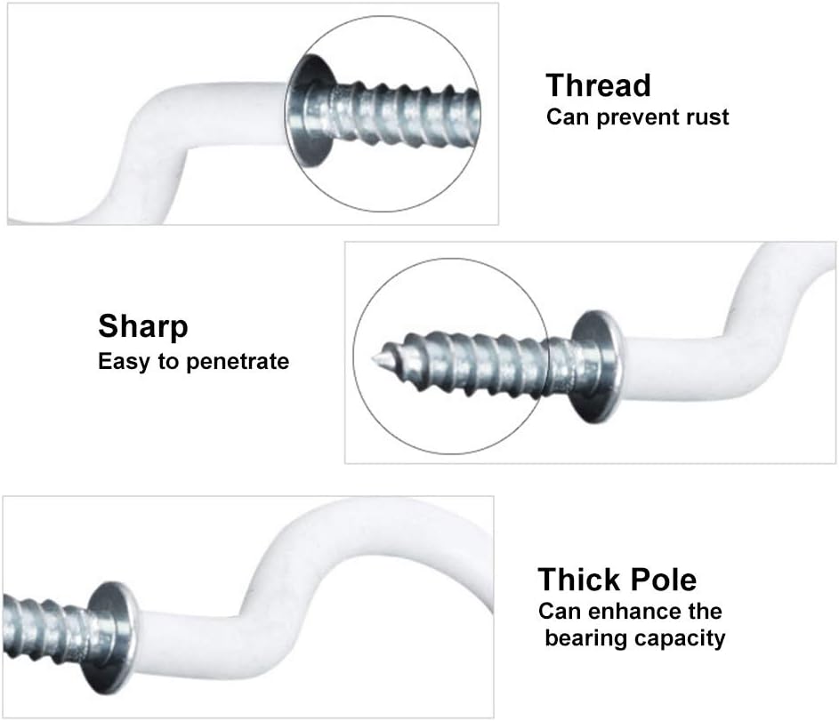 - Utility Hooks: Hooks can holds up around 50 pounds weight, it is made of durable steel, And it's coated with vinyl which is soft and smooth, protecting your hands and the item you hanging. The diameter of screw is 0.18 inch, drilling a smaller hole is recommended before turning thread.