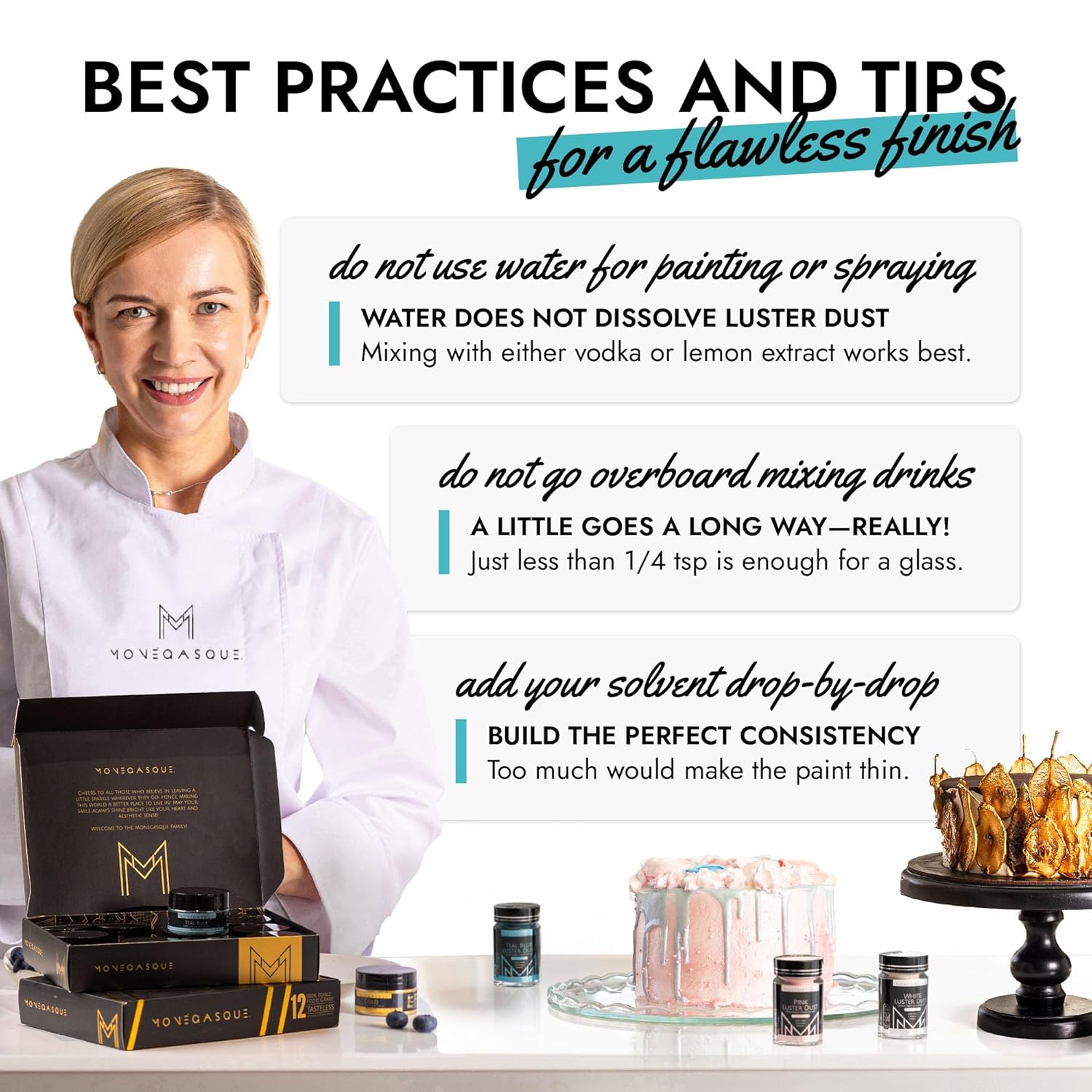 - EASY TO USE: Our teal blue luster dust is incredibly versatile. Apply with a wet brush, airbrush, or dry brush, and even mix into beverages. Achieve professional-looking results effortlessly at home, whether decorating halloween cakes or adding shimmer to cocktails.