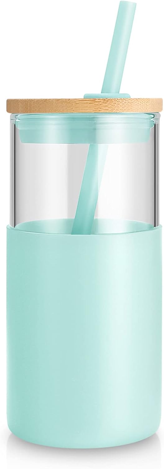 Tronco 16 oz Glass Tumbler with Straw and Bamboo Lid, Iced Coffee Cup Reusable, Smoothie Cups, Tumbler with Silicone Protective Sleeve - BPA Free